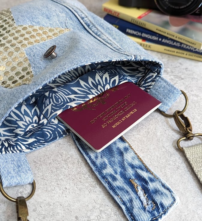 It has a blue and cream batik print cotton lining. A mid light khaki/beige strap compliments the silver star motif - but choose navy if you prefer. The strap and attaches to the bag with bronze coloured metal lobster hooks and d-rings and is adjustable to approx 162cm. The opening is secured by a flap made from a section of the waistband and is secured with a magnetic closure or a jeans style button.