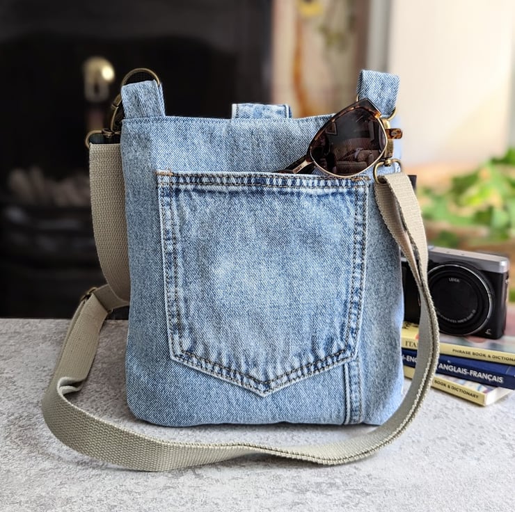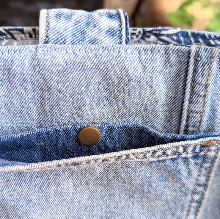 Handmade, and reducing waste by using pieces of recycled denim jeans that are no longer wanted, I've made the most of the character of the denim with the back of the bag having a usable jeans pocket secured with a plastic snap closure.