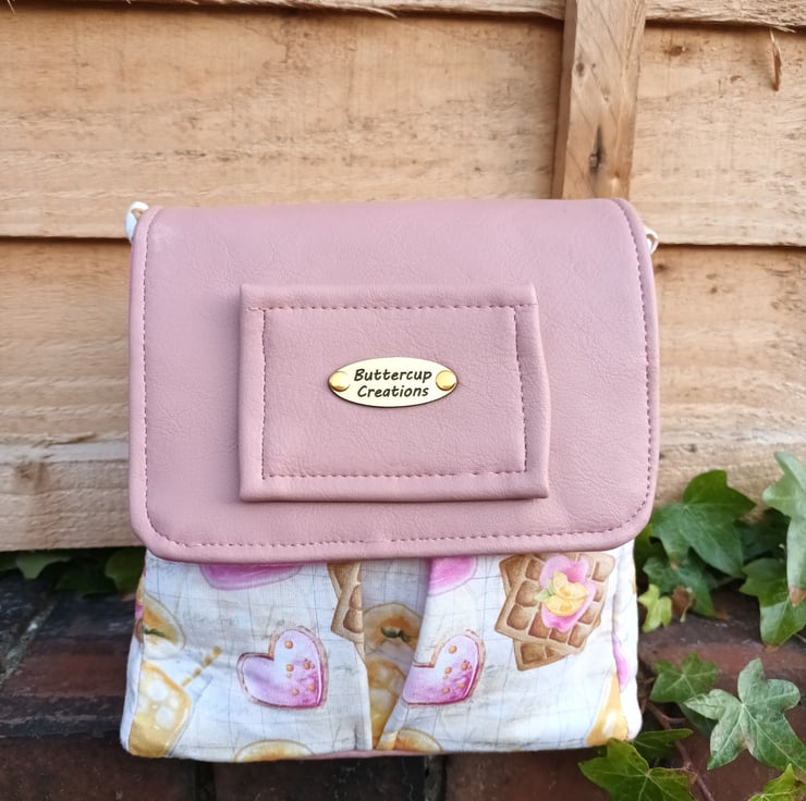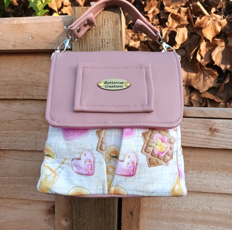 A mini rucksack with light pink leather accents, a waffle-inspired fabric print, and silver hardware would be a chic and versatile accessory. The light pink leather accents add a subtle touch of femininity and sophistication to the overall design. The waffle-inspired fabric print adds an interesting texture and visual interest, making the rucksack stand out from traditional designs. The silver hardware complements the light pink leather and adds a modern, polished look to the rucksack This combination creates a stylish accessory that can elevate any outfit, whether it's for a formal event or a casual outing.