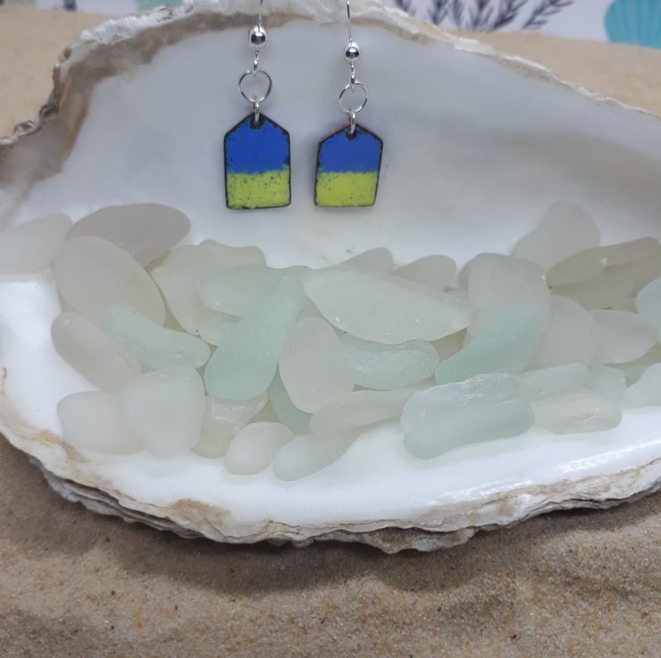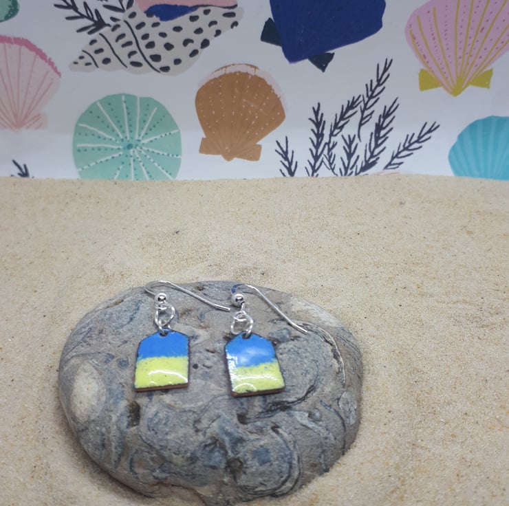 A pair of copper beach huts, enamelled (using vitreous glass enamels) in blue and yellow one side, and blue with multi coloured splashes on the other side.