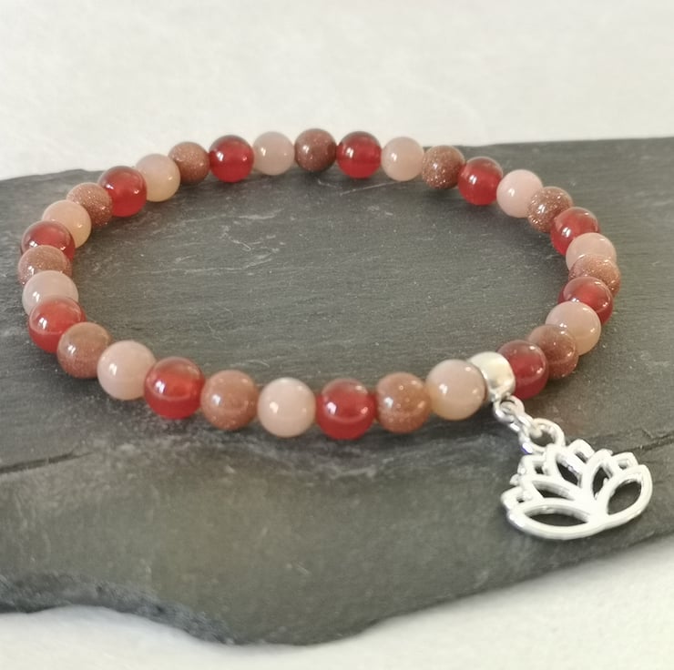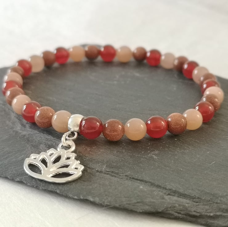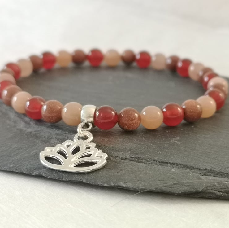 This stretchy bracelet features three gemstones all associated with the sacral chakra. Carnelian is known to boost creativity, sunstone enhances self-worth and goldstone promotes ambition. The lotus flower is there to signify spiritual growth and enlightenment.