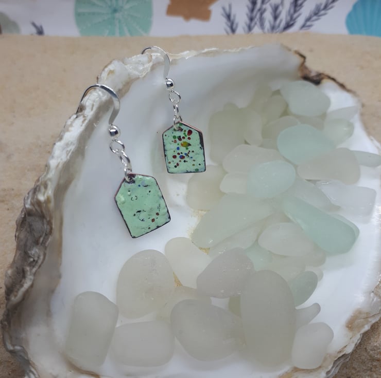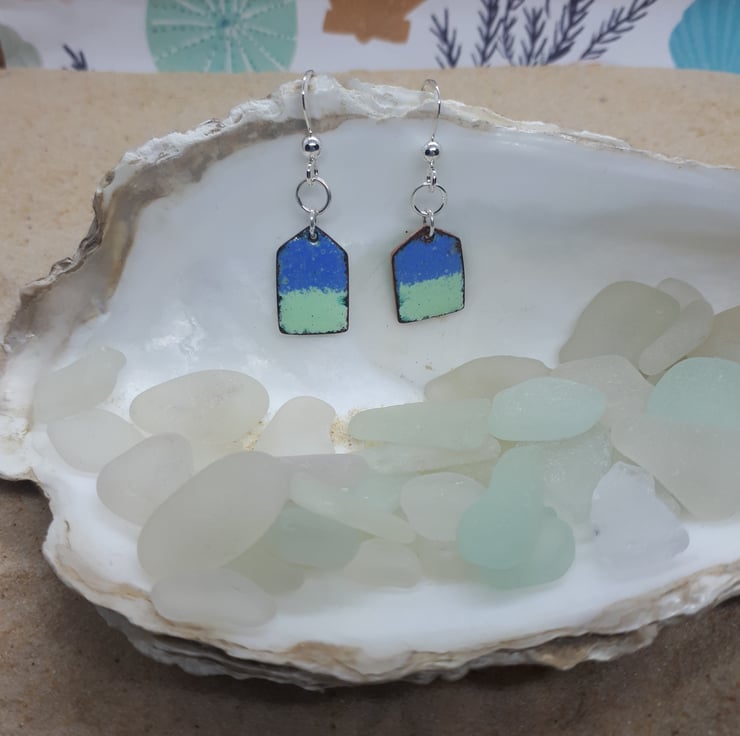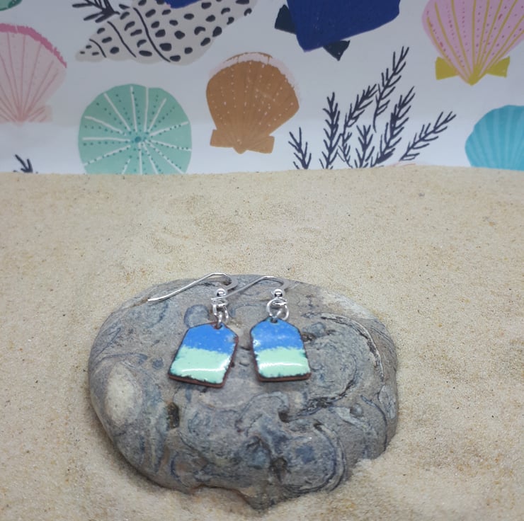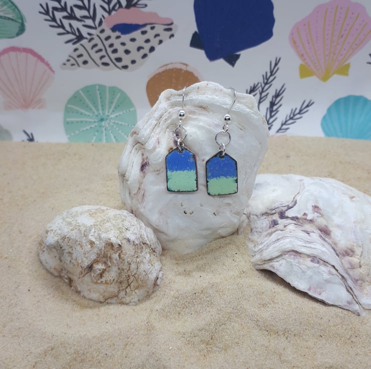 A pair of copper beach huts, enamelled (using vitreous glass enamels) in blue and mint one side, and mint with multi coloured splashes on the other side.