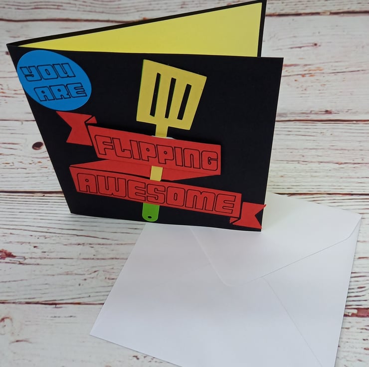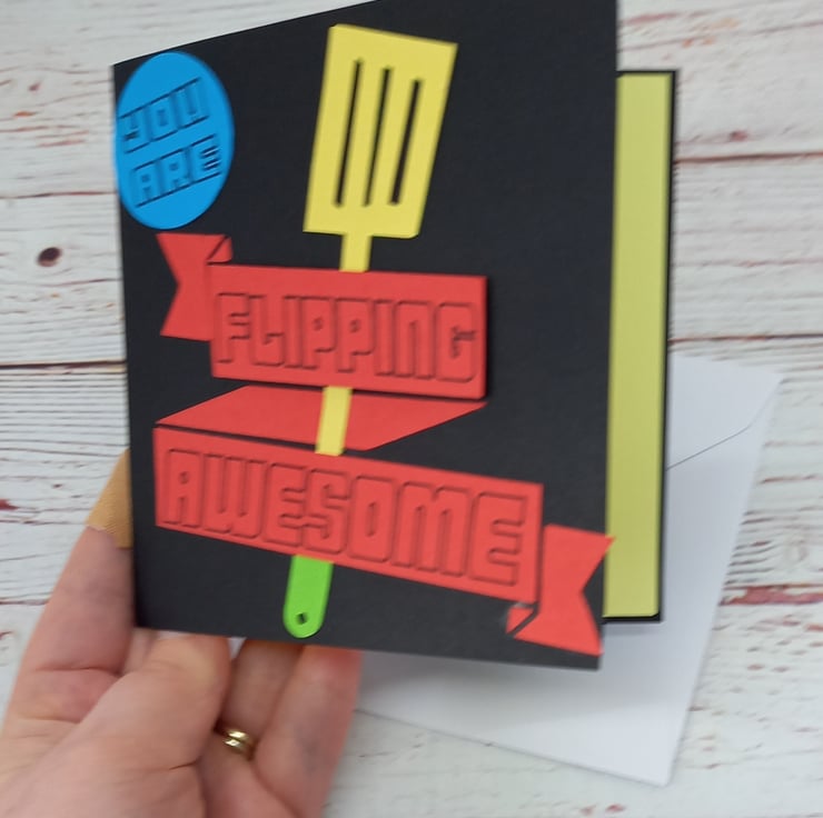 Featuring the words 'You are Flipping Awesome' boldly printed across a spatula this card is certain to make its recipient smile