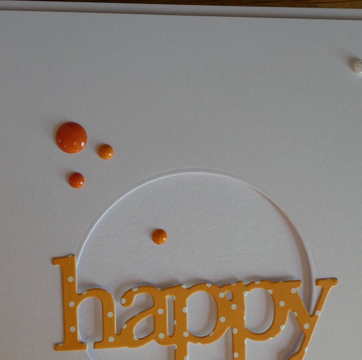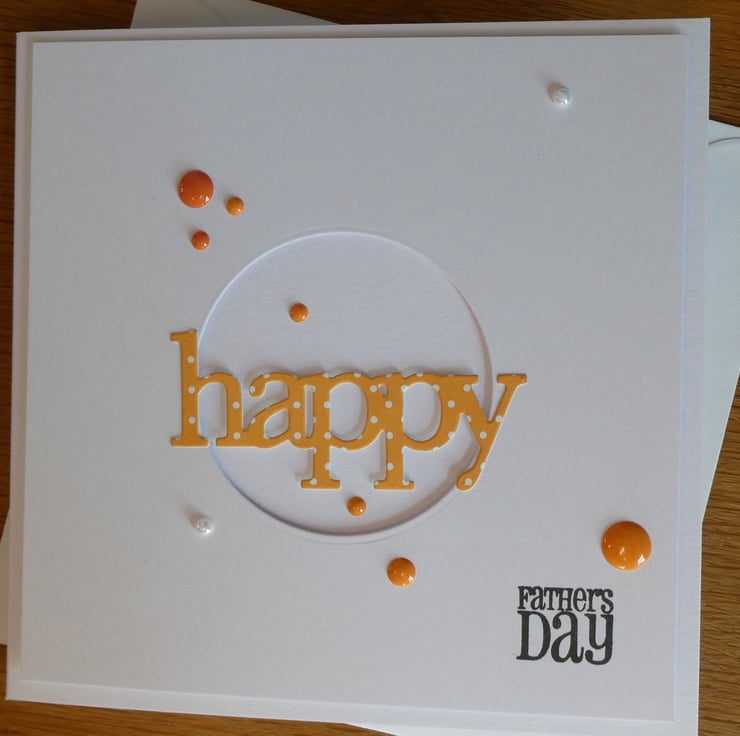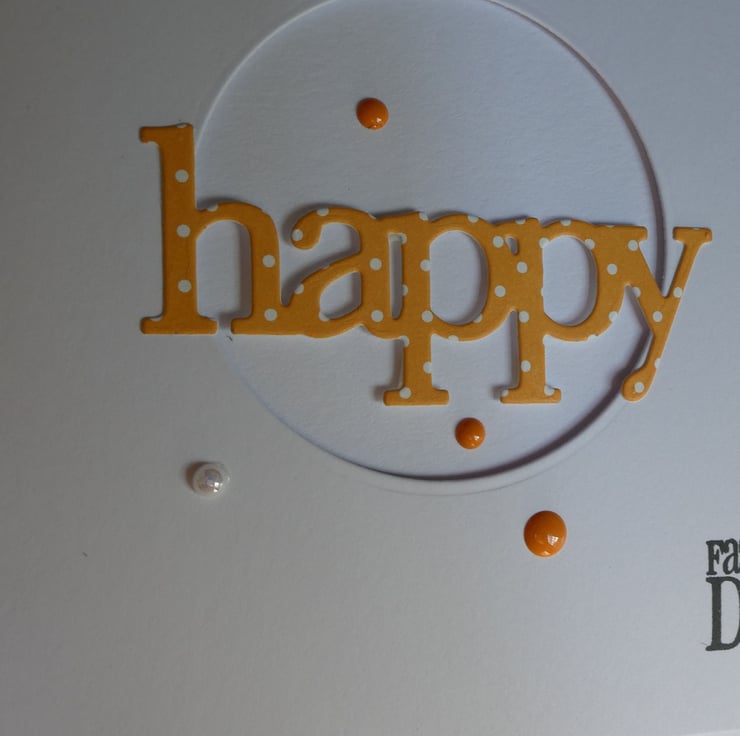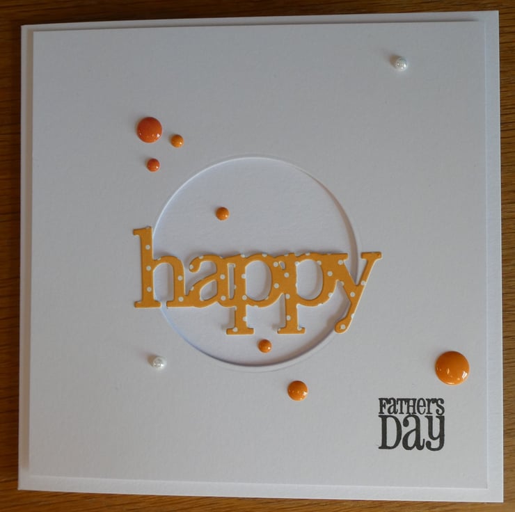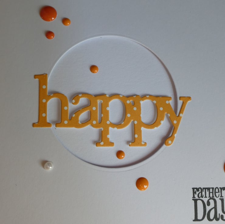 This Father's Day card has the word 'happy' cut from bright orange and white polka dot card over a circular aperture which has been die cut by hand into a square of quality white card and attached with foam pads to raise it from the card front.