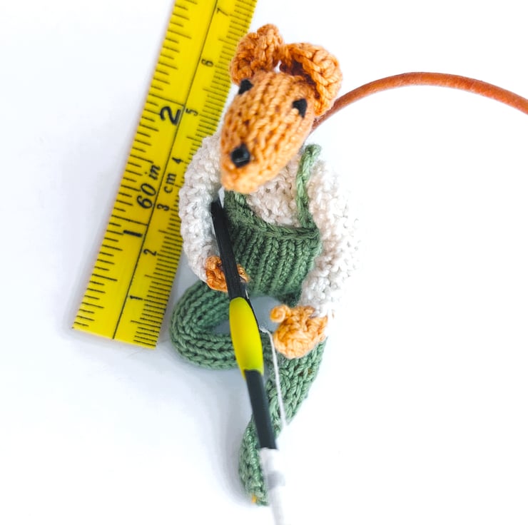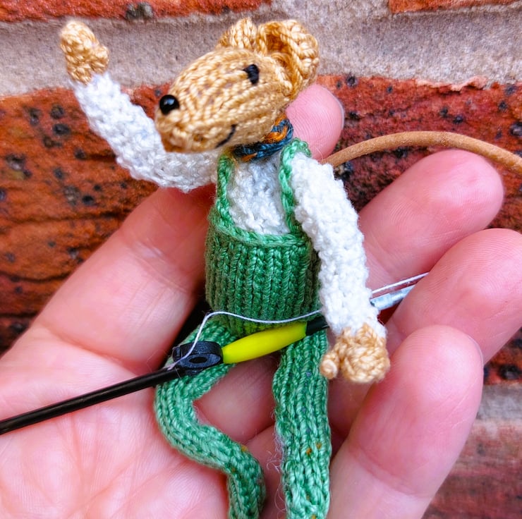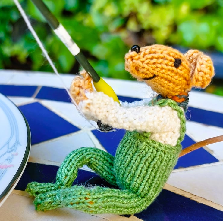 I have been designing & making tiny knitted characters for a few years to populate a little imaginary seaside town - 'Little Yarnings'. I have been working on adding armature to the tiny characters but this, scaled up version of one of the characters, is more 'user-friendly' as, being larger, I could more easily add a pipe cleaner armature to make him positionable. I wanted to include a fisherman as I'd seen what a great time Paul & Bob had river fishing in their TV programme! Every character is made from scratch - I don't bulk make 20 identical mice to sell; this means that even if I make another fishing mouse, they will have different features, different shaped ears, tail etc. giving you a totally unique companion.