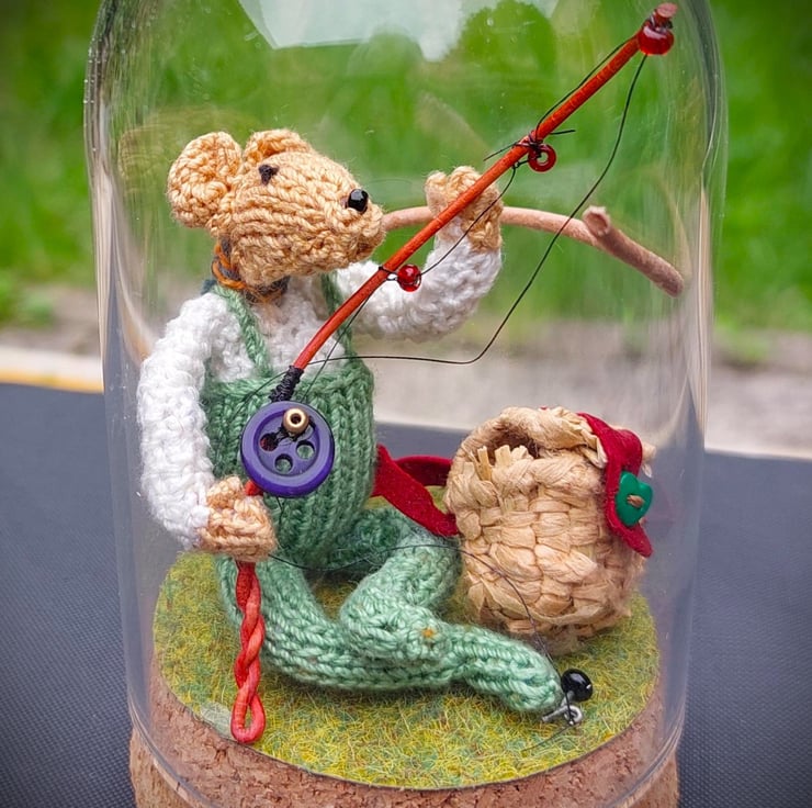 10cm knitted fishermouse in a presentation glass dome. Totally unique item... Know someone who is fishing mad? Like to have someone to share your love of fishing? This 'MidiKnit' will be just perfect: a 10cm tall knitted mouse dressed in fishing waders & carrying his own tiny fishing rod and handmade fishing creel - ready to hold his catch. Imagine looking up at him sitting on your desk/ laptop/ shelf & transporting you back to peaceful days spent fishing in beautiful countryside. This is a totally unique item - designed & made individually by Mrs K. It is poseable as it has a wire armature; for this reason it is not a toy, it is a collectable - not suitable for children. This character & their belongings will come wrapped in the glass dome, ready to position yourself to avoid being damaged during transit.