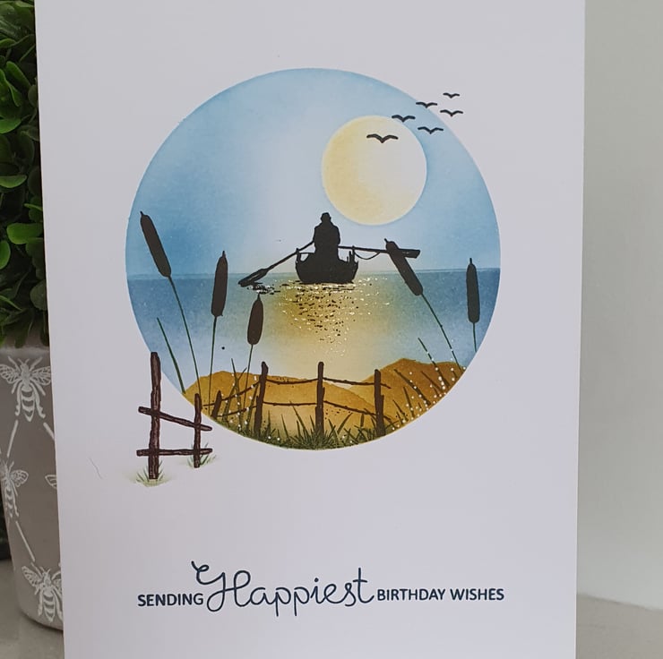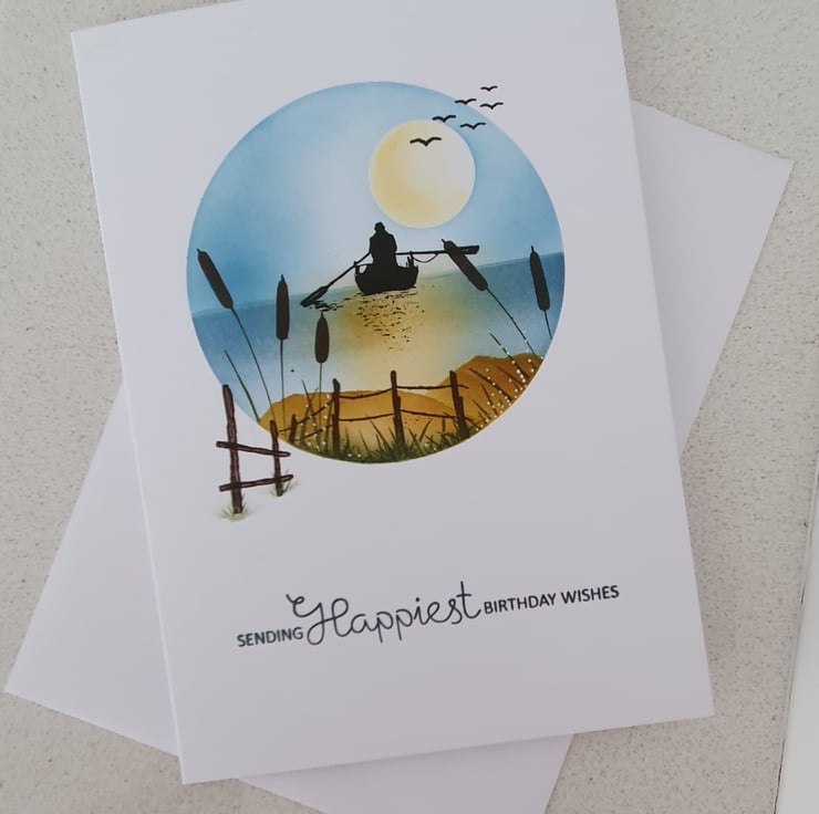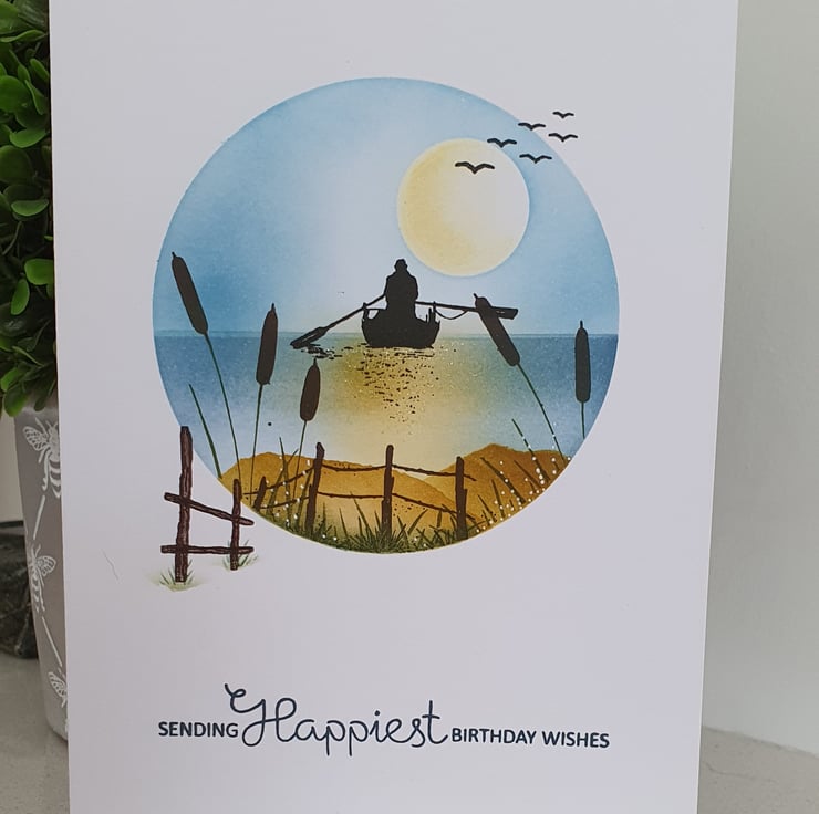 All ink blended and stamped directly on to the base card which is of a quality 300gsm cardstock and is approx 7x5 inches.This idyllic scene is created within a circle aperture.