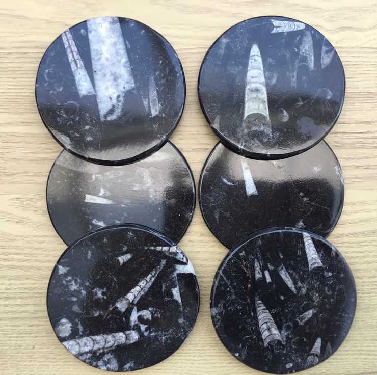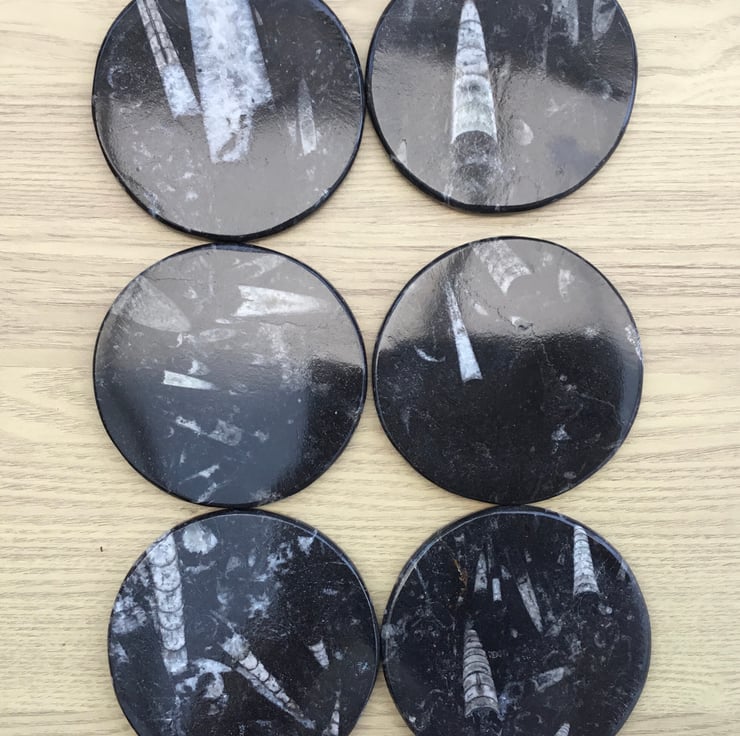 Orthoceras Abound! A pretty set of 6 substantial orthoceras stone coasters for home decor. A great gift as durable as well as pretty, a useful set of coasters but a great gift for Father’s Day perhaps, or for a fossil collector or enthusiast.