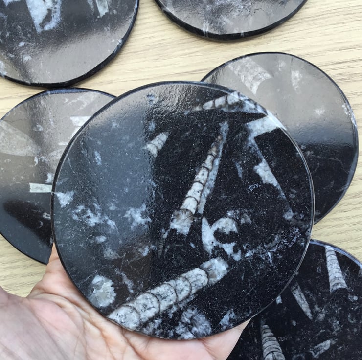 Each coaster is unique in its pattern and spread of orthoceras fossils within.