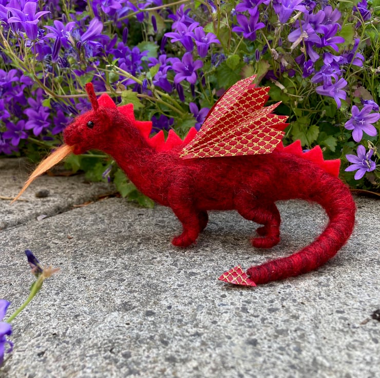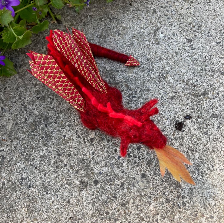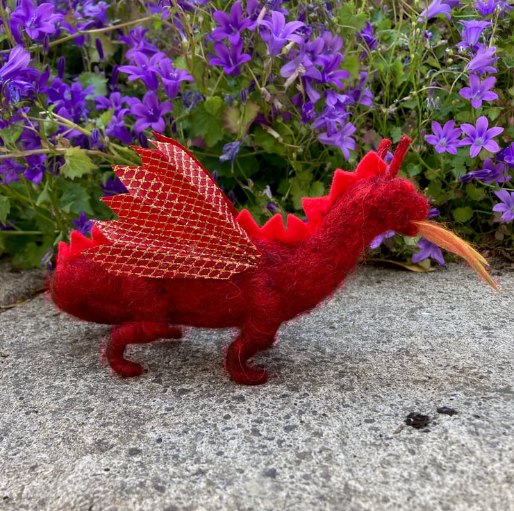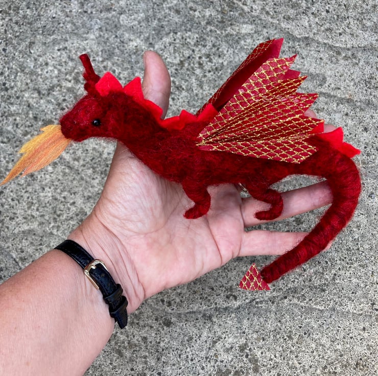This adorable little fire breathing red dragon has been needle felted using woollen fibres. Core wool has been sculpted into shape using a barbed felting needle and a coloured top coat added. The dragon is red in colour with a slightly lighter red felt having been used for the spines along his back. The wings and tail end have been made using a red cotton fabric overlaid with a gold coloured net. Black half pearls have been used for the eyes and a woollen "flame" has been made and placed in his mouth.