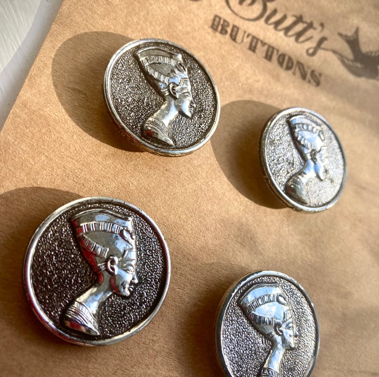 4 Vintage Silver Nefertiti Buttons, these are made of plastic, they are showing some signs of their age but lovely neither the less!
