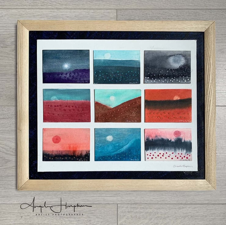 Framed watercolour picture with nine individual ACEO imaginary watercolour landscapes with hand embroidery, collaged on canvas board and open framed in light wood without glass. The work is varnished to protect from dust, it has D rings and cord affixed ready to hang. Each painting and the final work is hand signed by me. Use a soft duster to clean.