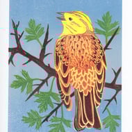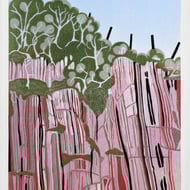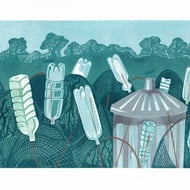This is an original reduction lino cut print, one of a small limited edition of 15. It was created from two lino plates, one for the blue and greens, the other for the yellows.
