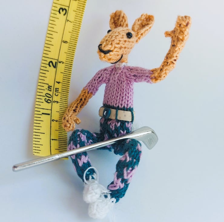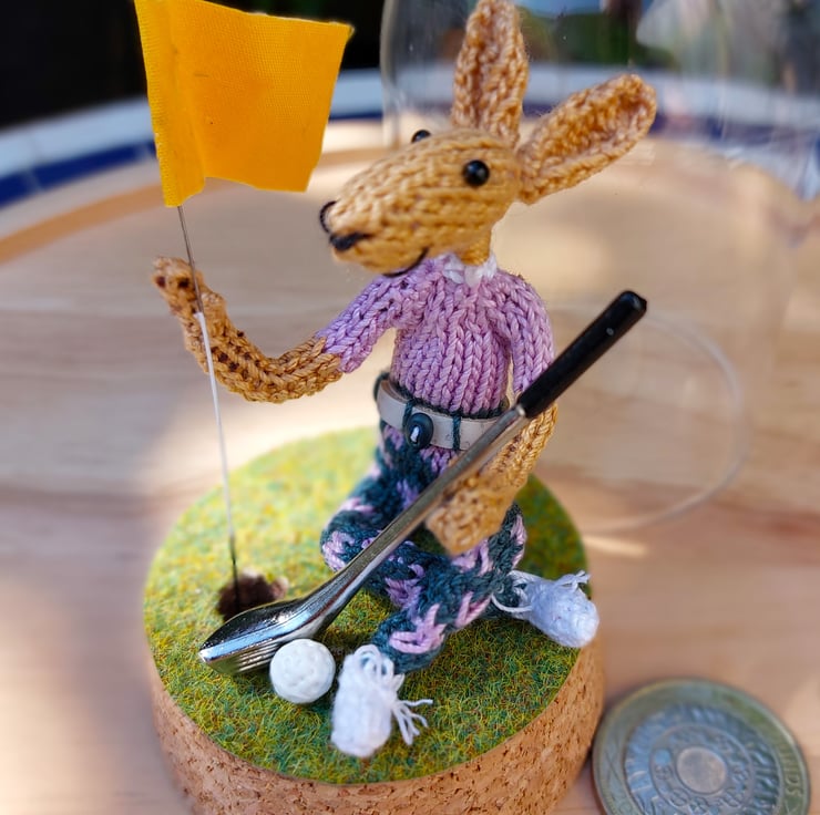 A 10cm tall knitted golfing rabbit in a presentation glass dome. Want something totally unique? Know someone who is golf mad? Want company while you go about your day? This 'MidiKnit' will be just perfect: a 10cm tall knitted rabbit dressed in jazzy golfing gear - patterned teal & pink trousers with a white belt, a plain pink top and he is carrying his own tiny golf club. He can sit on your desk/ laptop/ shelf & remind you of relaxing days spent walking the golf course. This is a totally unique item - designed & made individually by Mrs K. It can be positioned as it has a wire armature and has traditional wire & glass eyes. For this reason it is not a toy, it is a collectable - not suitable for children. This character & their belongings will come wrapped in the glass dome, ready to position yourself to avoid being damaged during transit.