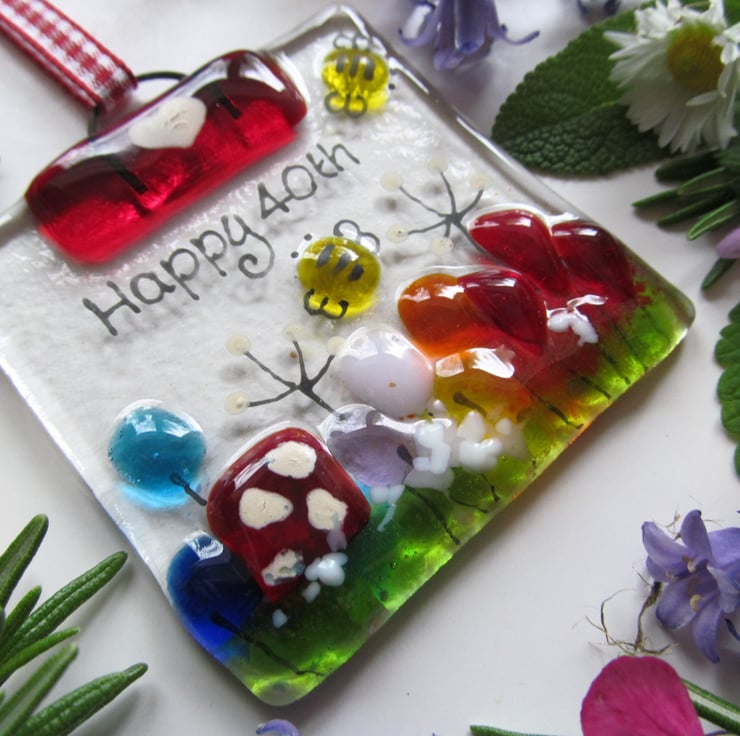 This toadstool inspired mini fused glass suncatcher can be made to order for a special person or occasion. Have your chosen name, wording or short caption hand painted and fired into the glass to make it a truly unique gift.