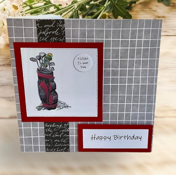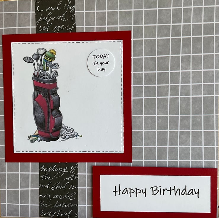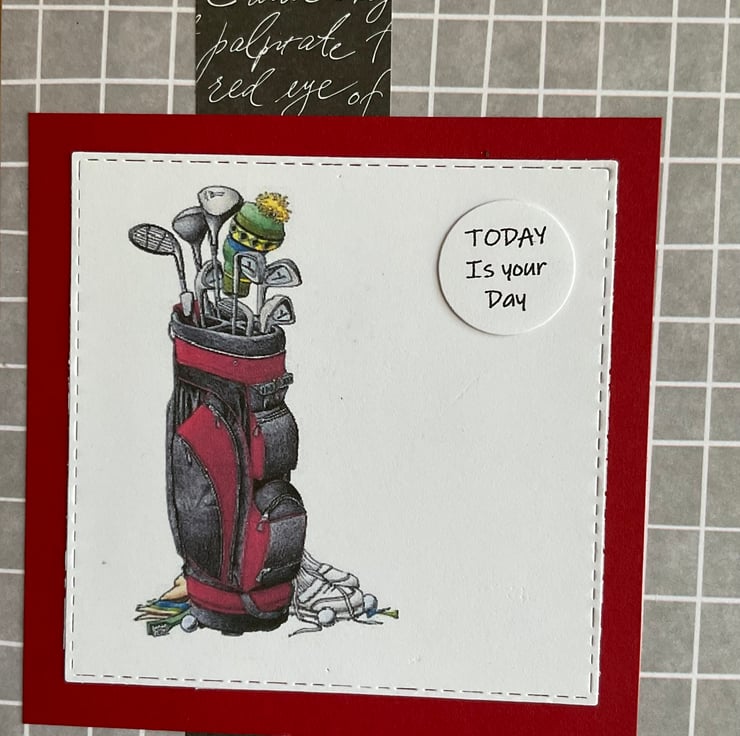 The golf themed image has been printed onto white card and die cut then layered onto a red card square.