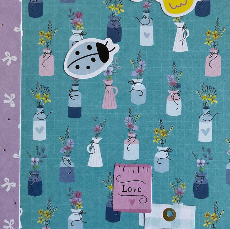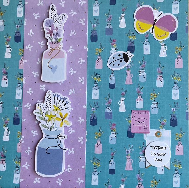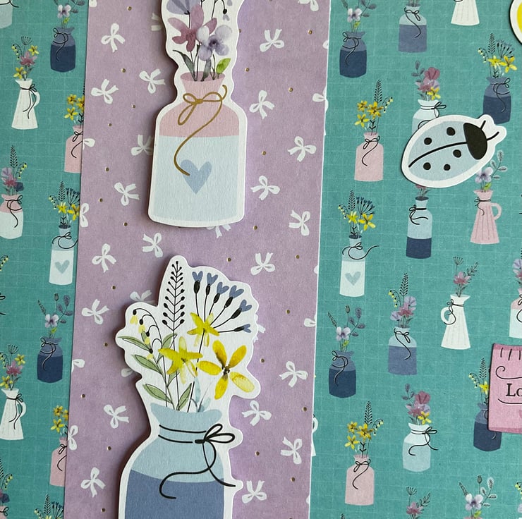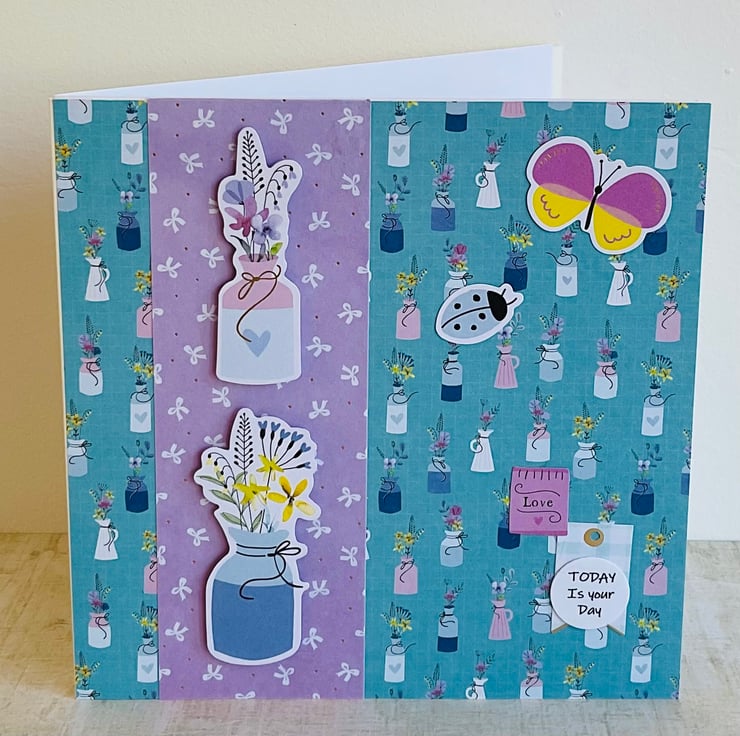 Die cut floral bouquets in colourful vases have been applied using a 3D texture to add depth to the card.