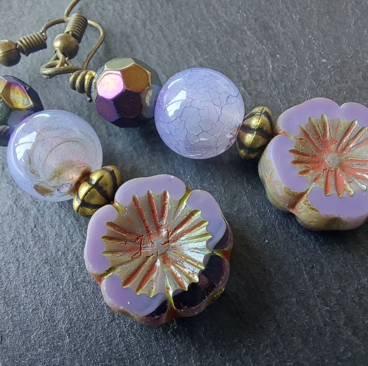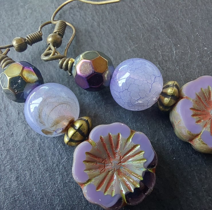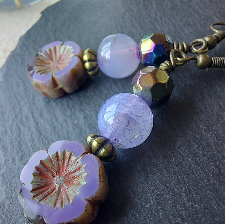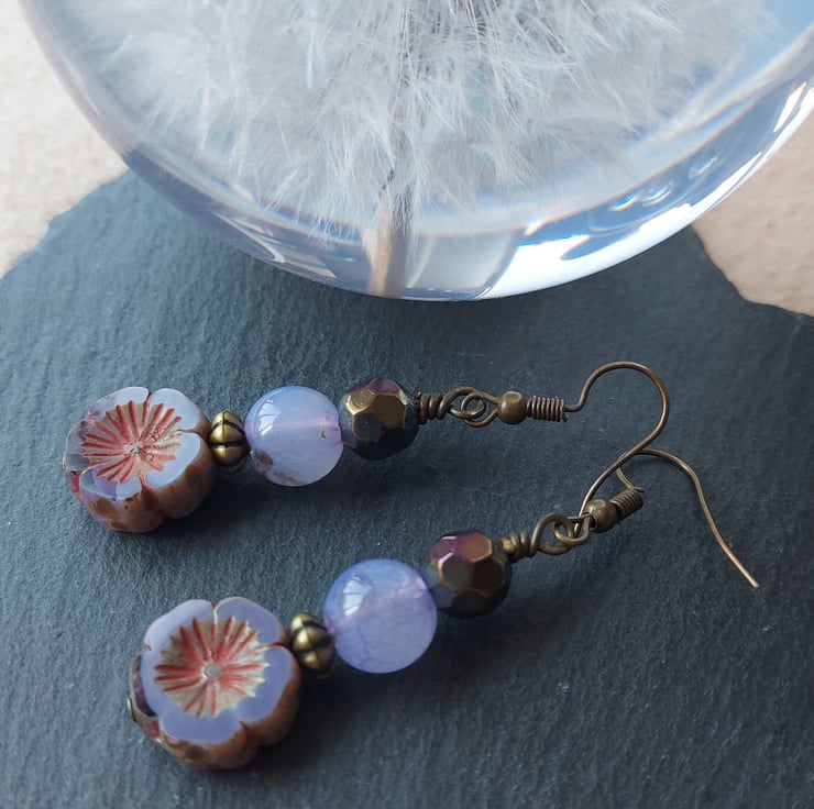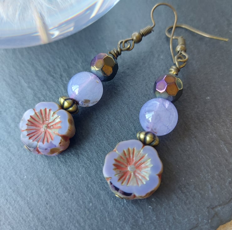 Dangle Earrings - 5cm drop. Made with glass Czech flower beads and two dyed agate beads. Colours are bronze and lilac.