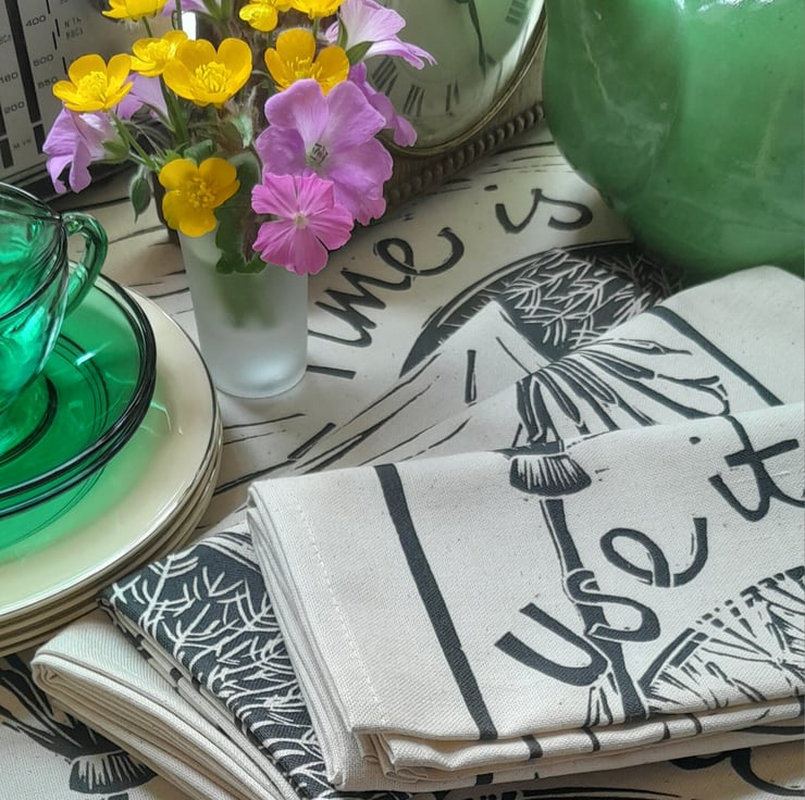 This ‘Time is Precious’ tea towel features an enlarged reproduction of my original linocut, digitally printed in black ink onto a lovely natural, unbleached 100% cotton fabric.
