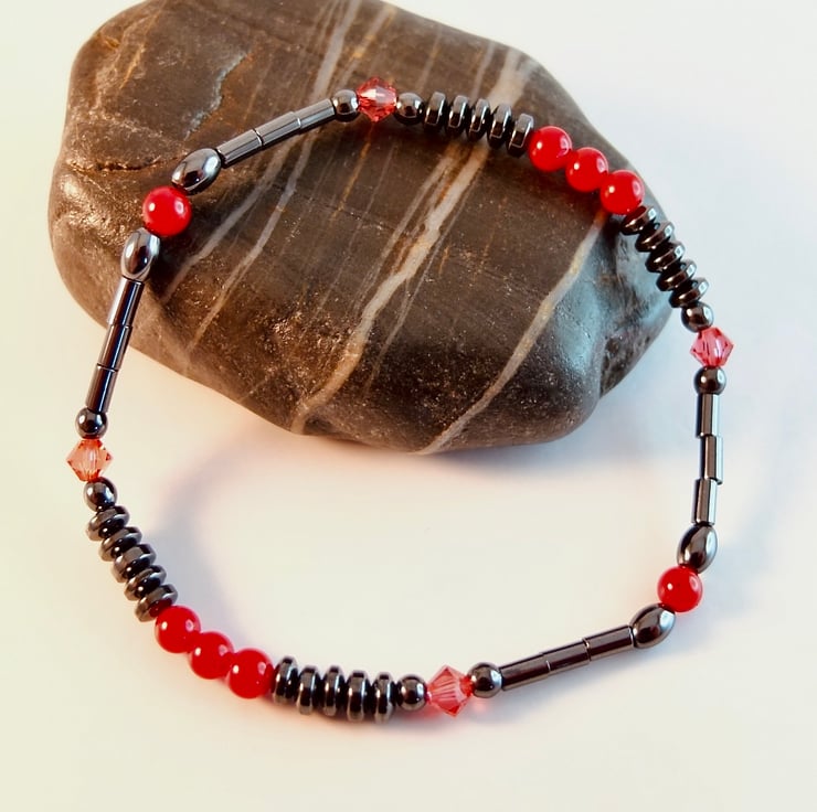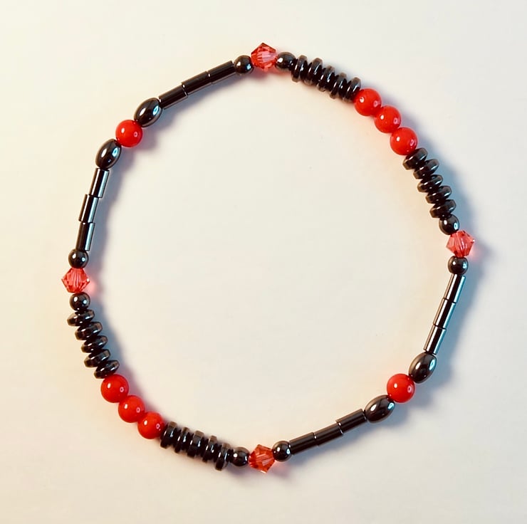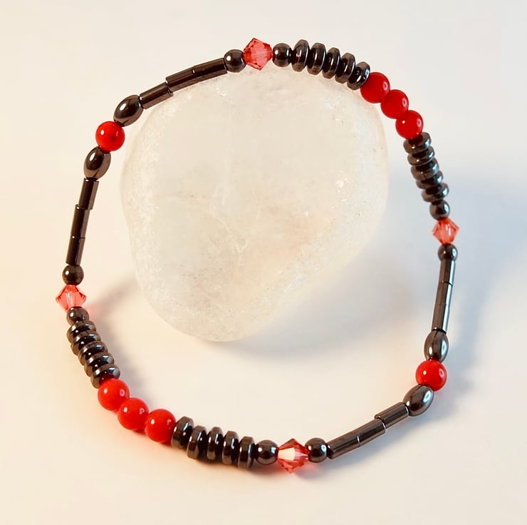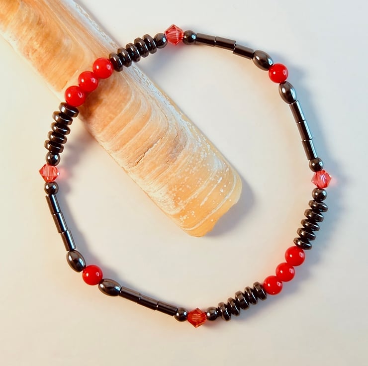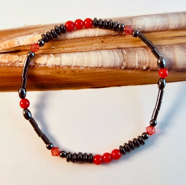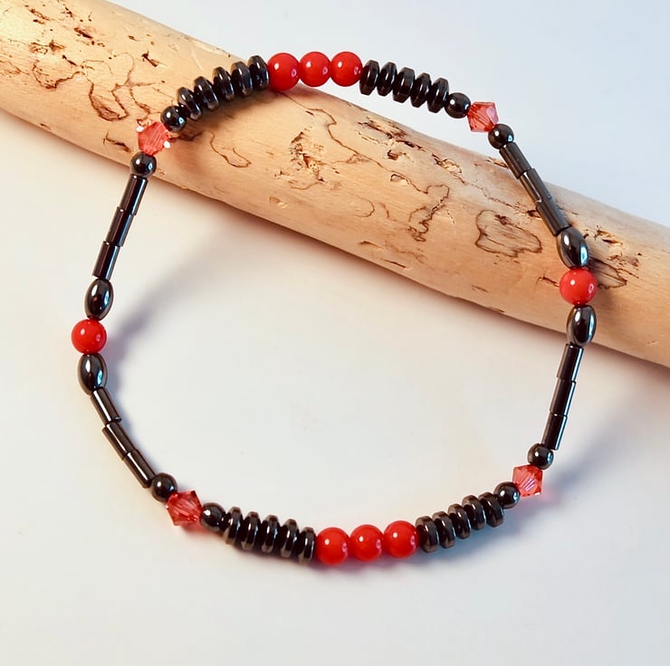 Dainty bracelet made from assorted small Hematite beads - tubes, discs, ovals and rounds - interspersed with 4mm red Bamboo Coral and 4mm 'padparadscha' Swarovski bicones.