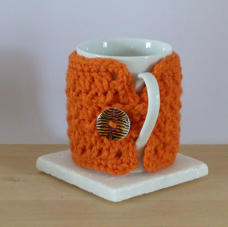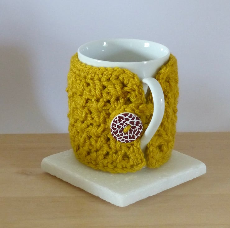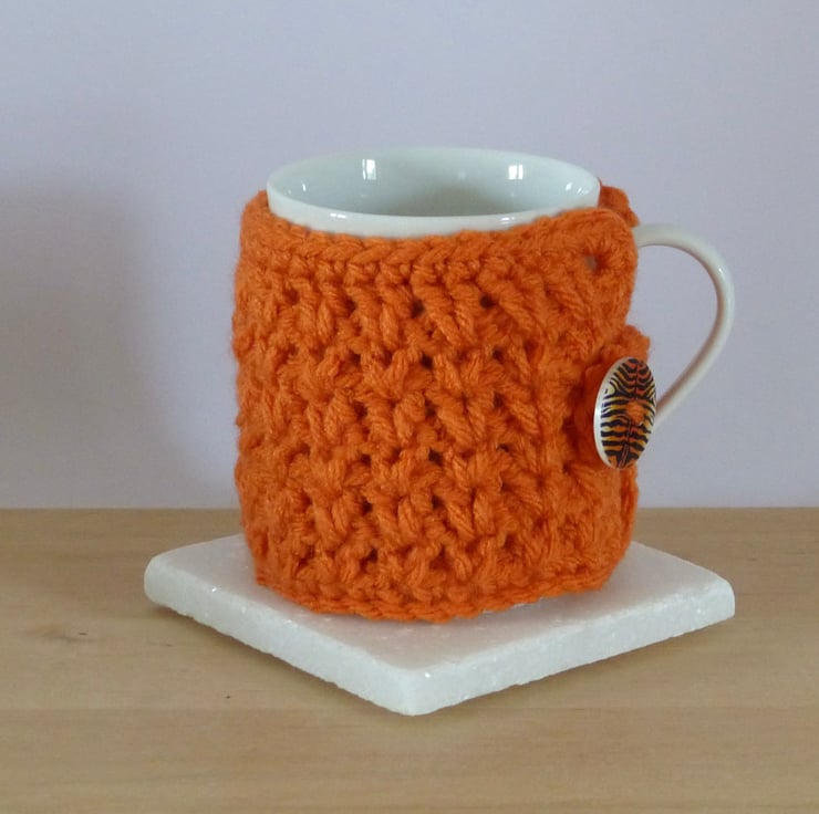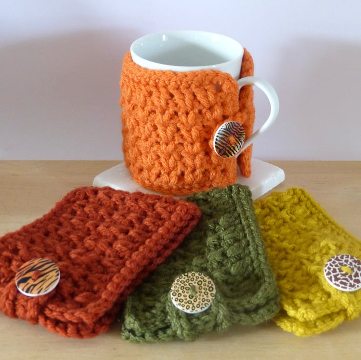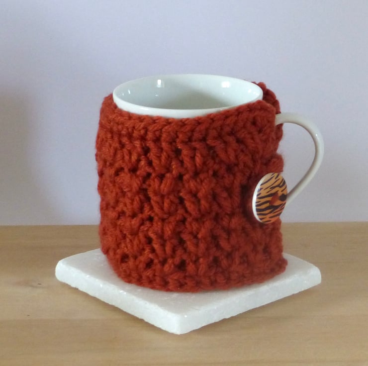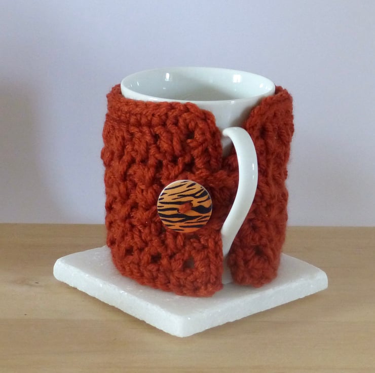 A crocheted Mug Cosy using a chunky Acrylic yarns. Currently available in Spicy Orange, Green, Copper and Mustard. They measure approximately 25cm long by 8.5cm wide so should fit most standard mugs. Just wrap around and fasten with the crocheted loop and large wooden animal skin design button. An ideal gift for a Tea or Coffee Lover or as a Secret Santa Gift or Stocking Filler. Just message me to let me know the colour(s) you require.