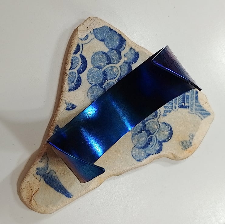 I have hand sawed the shape from 1mm titanium sheet, carefully finished the edges and then sanded, hammered and polished it before shaping and torch colouring.