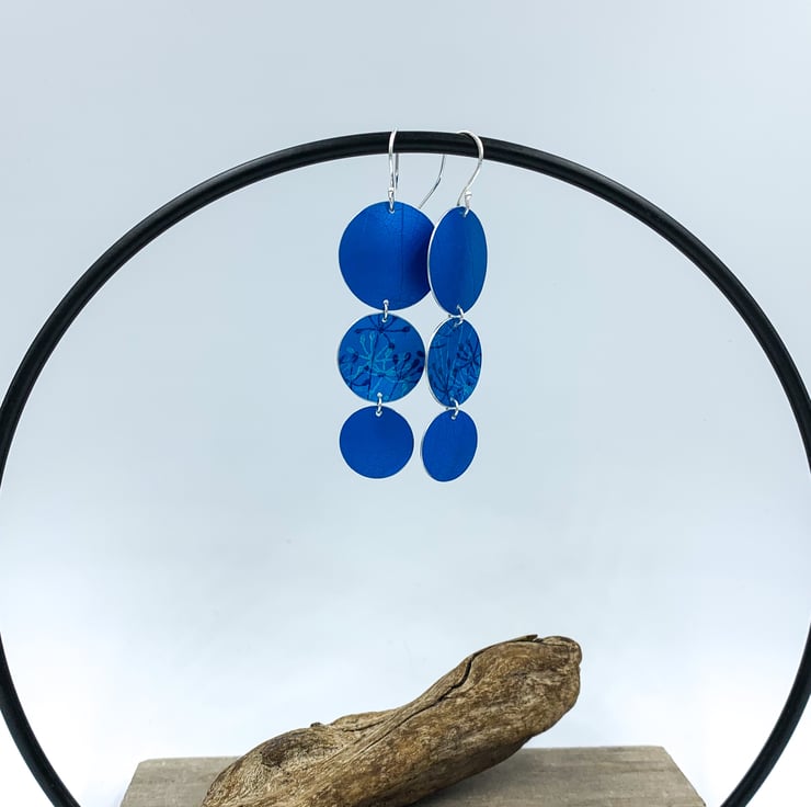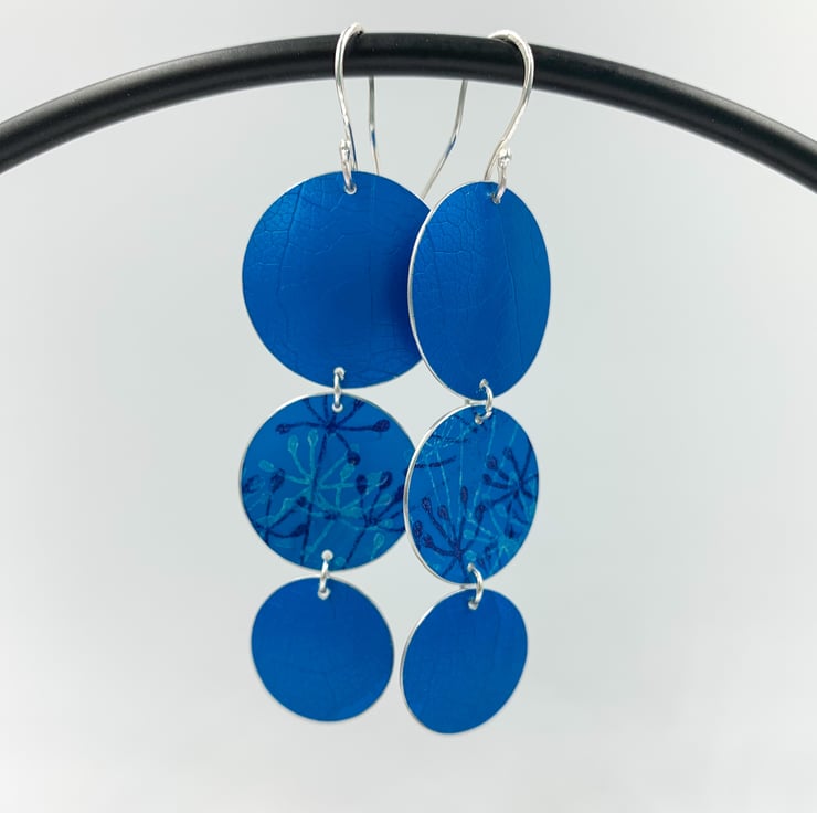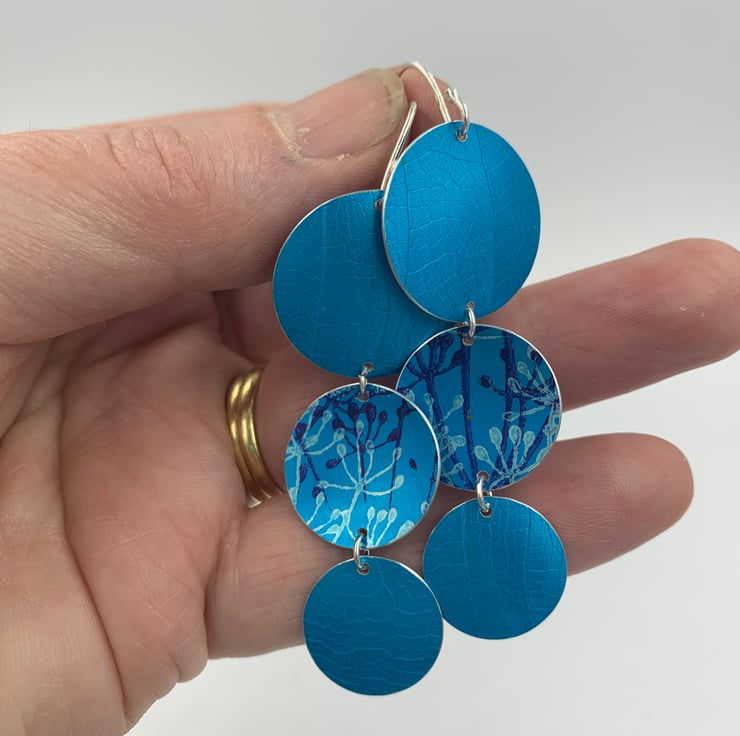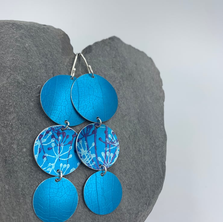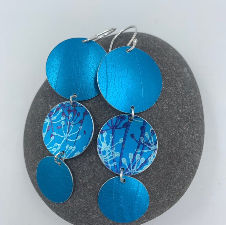 Statement dangly earrings made from hand dyed and printed anodised aluminium. Two discs have been textured with a leaf skeleton, the other printed with a cow parsley design.