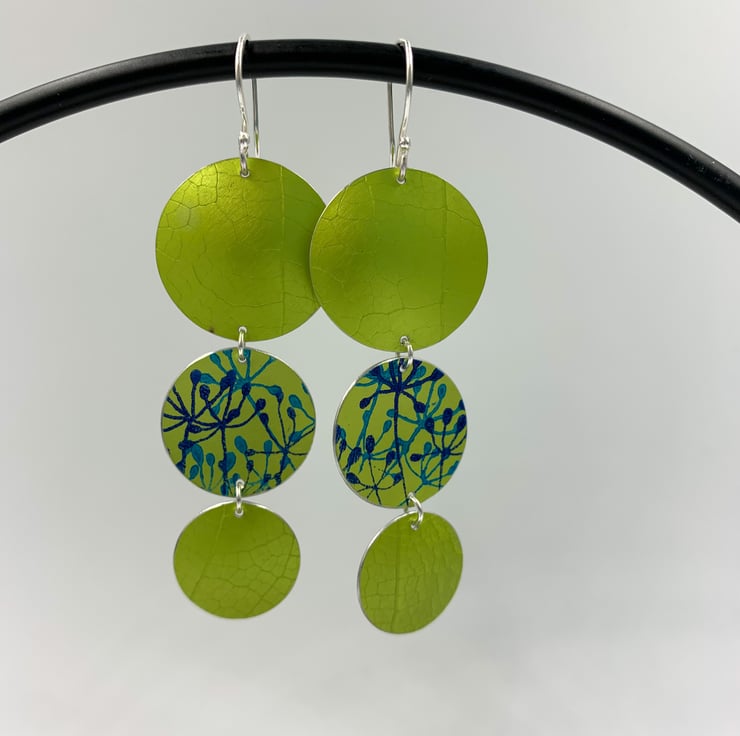 Statement dangly earrings made from hand dyed and printed anodised aluminium. Two discs have been textured with a leaf skeleton, the other printed with a cow parsley design.