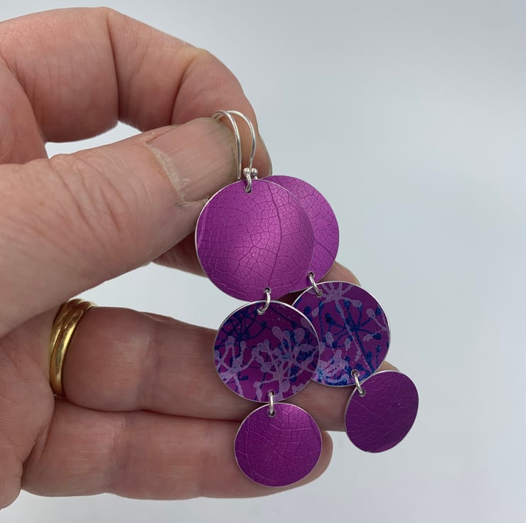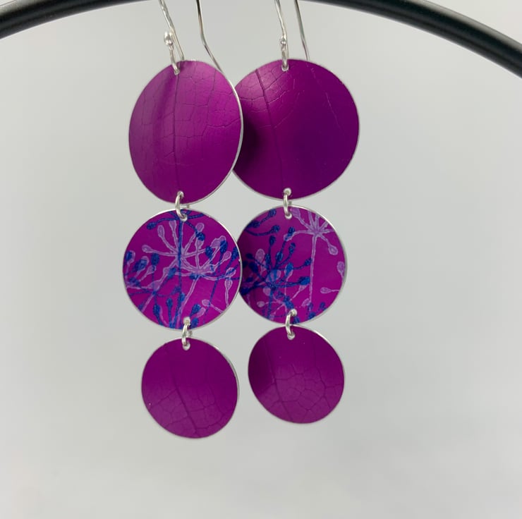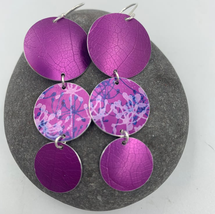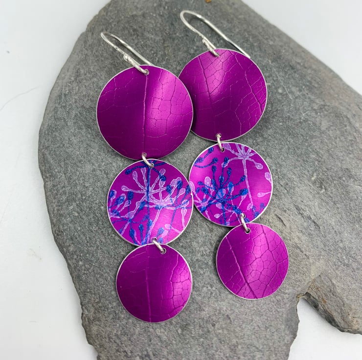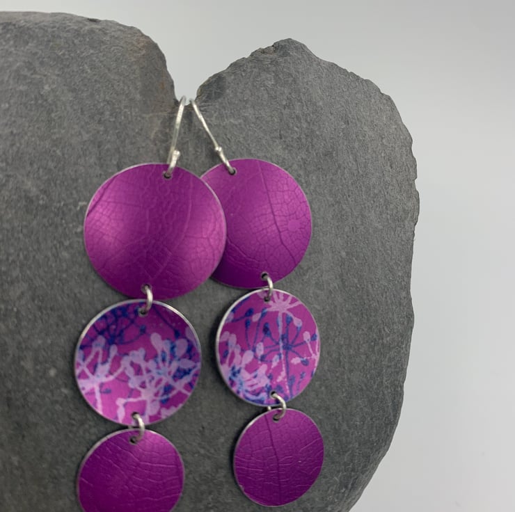 Statement dangly earrings made from hand dyed and printed anodised aluminium. Two discs have been textured with a leaf skeleton, the other printed with a cow parsley design.