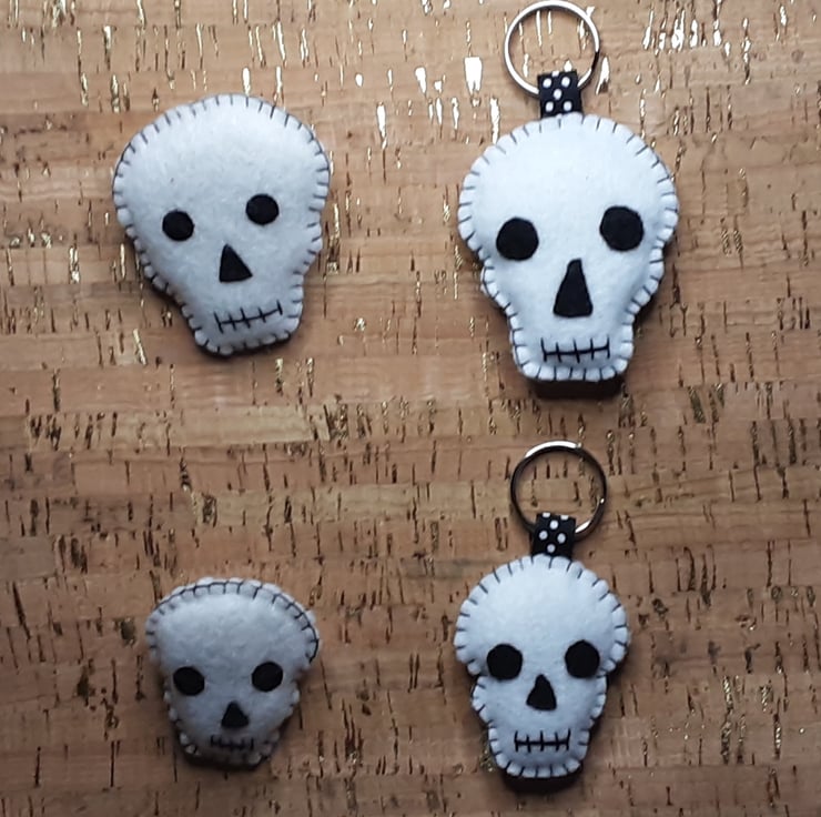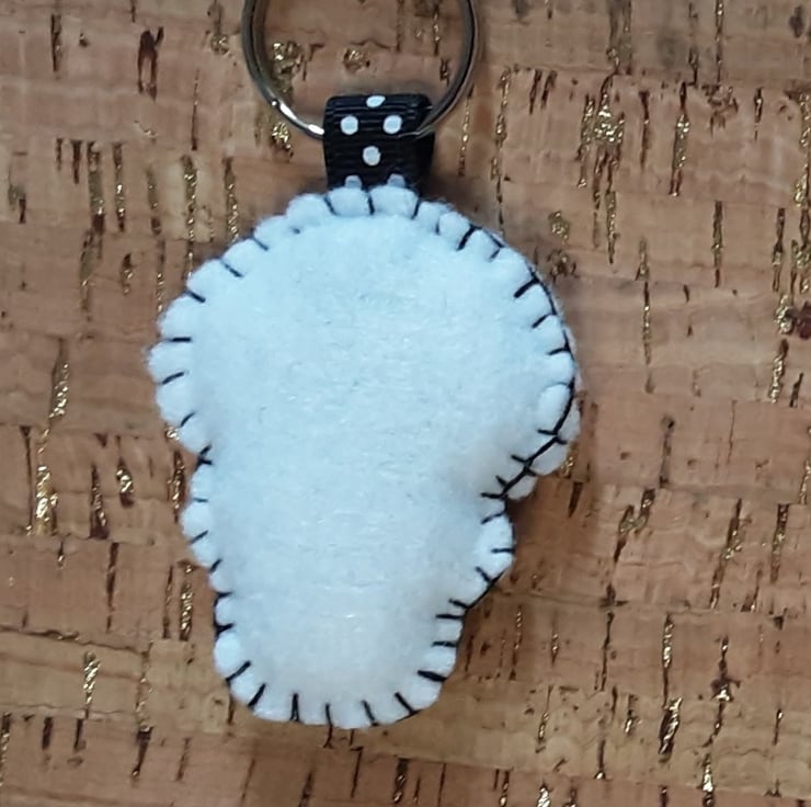 The main colour of the skull is white. Mouth is stitched in black thread. The eyes and nose are made from black felt.