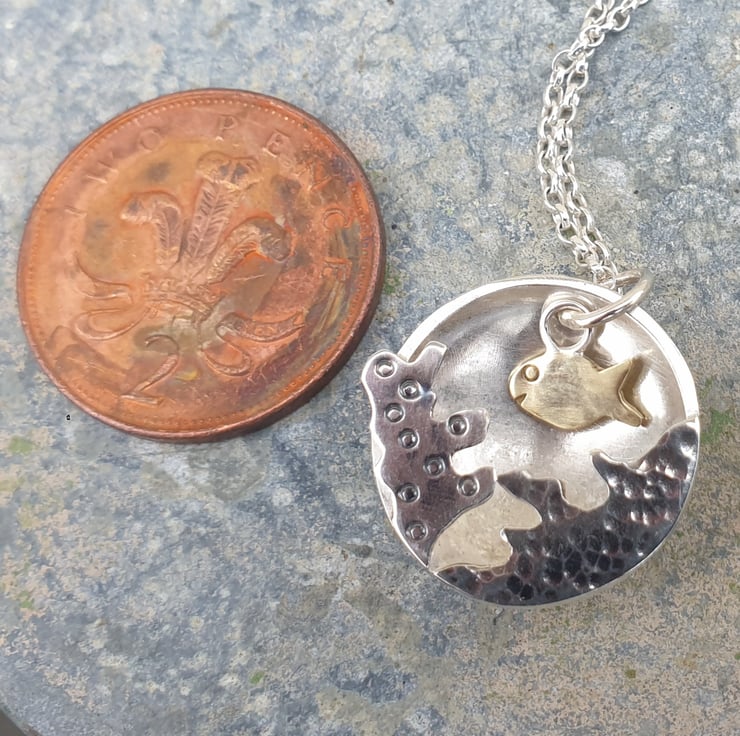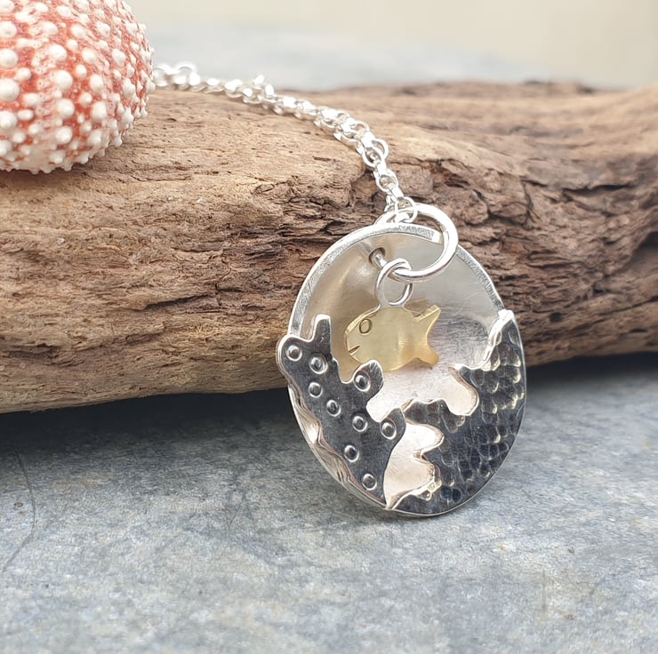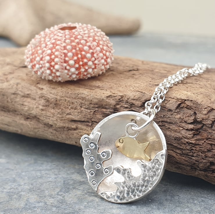 This pendant is inspired by a recent snorkelling trip to Egypt. The domed back is made from 0.8mm sterling silver sheet with two hand sawn and textured pieces of 'coral' attached to the front. The little brass fish hangs freely from a silver jump ring to swim within the dome.