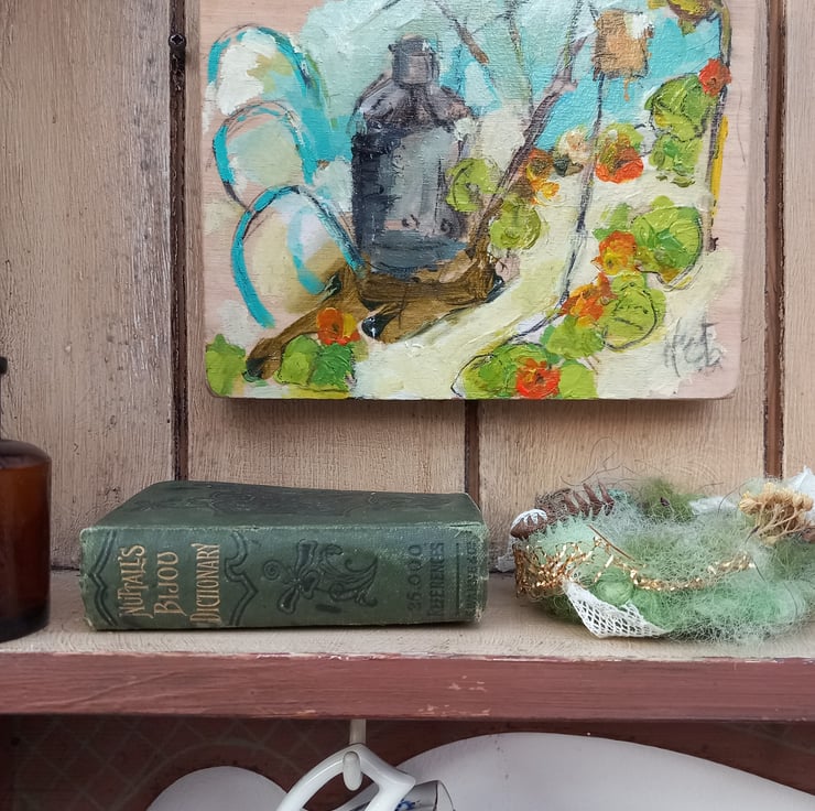 A small sweet painting, original art in my signature style. A painting on canvas board that tells a story. Celebrating spring 18 apox cm tall , signed and lightly varnished. painted from the heart and everyone is different. Small 15 cm long