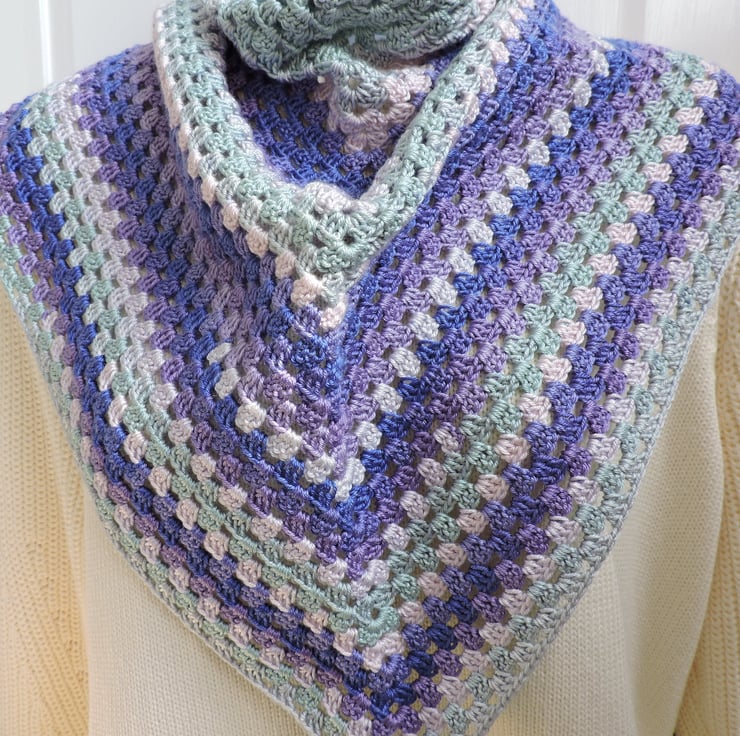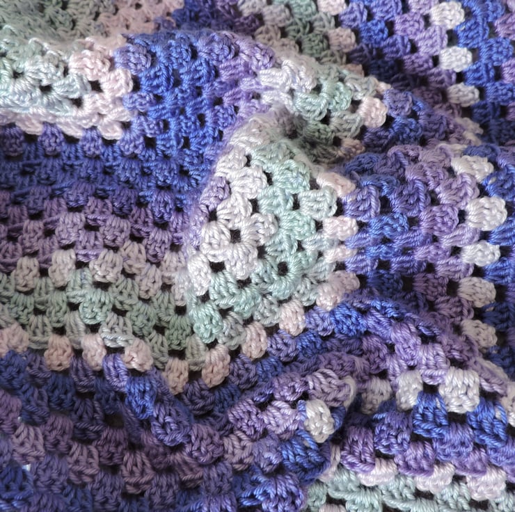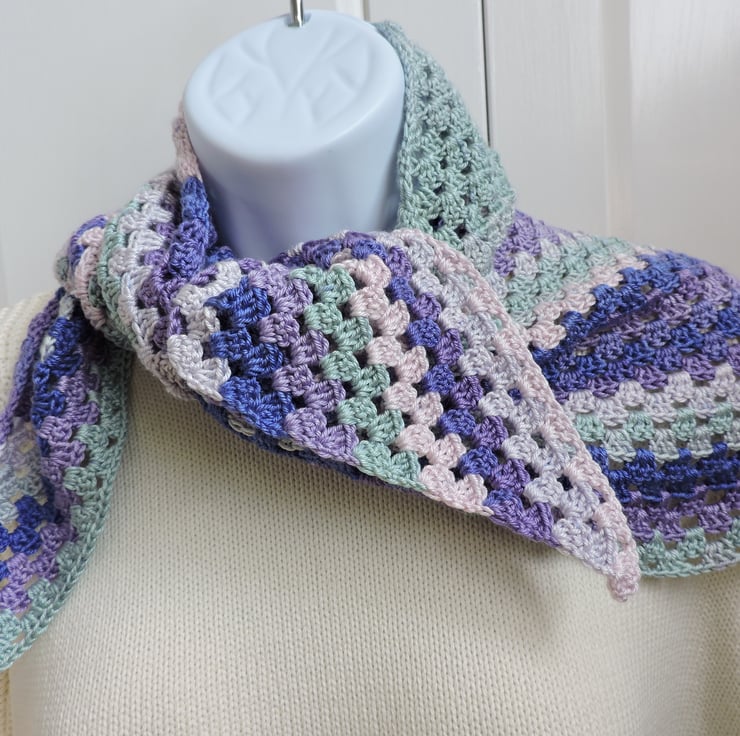 Sale This pretty crochet shawl has been made with a lightweight microfibre acrylic yarn. Graduated colours of sapphire blue, duck egg blue, pale pink and lavender. Soft and supple makes this perfect for the spring, summer, autumn or evenings.