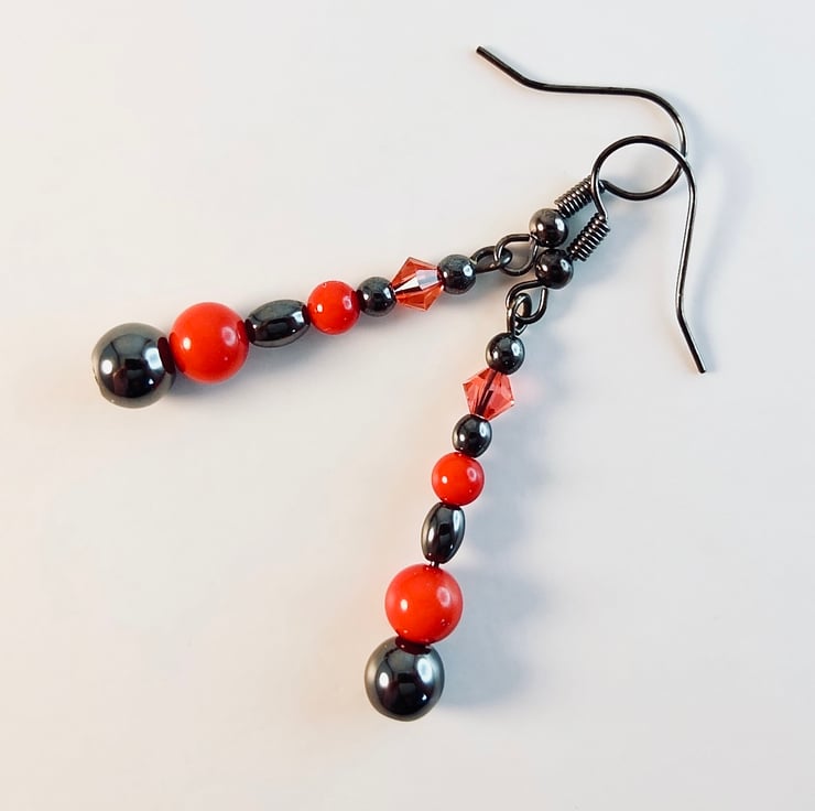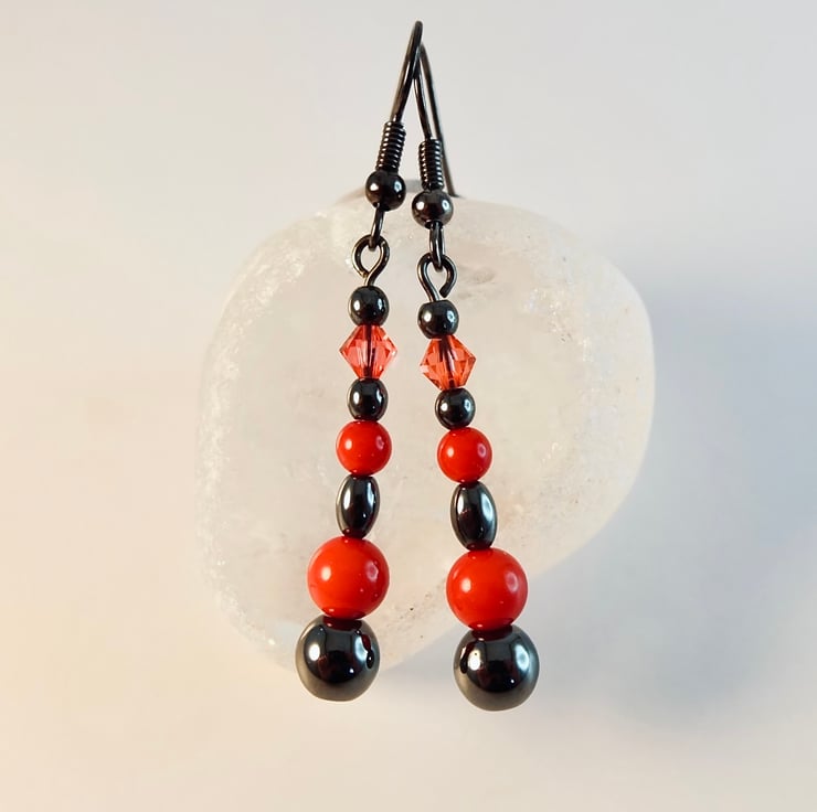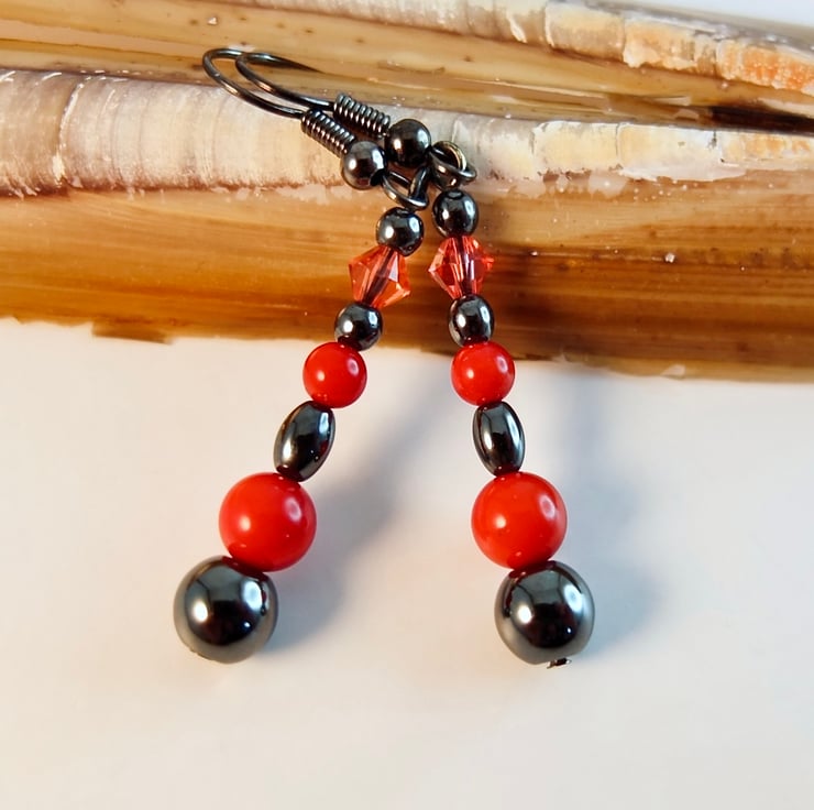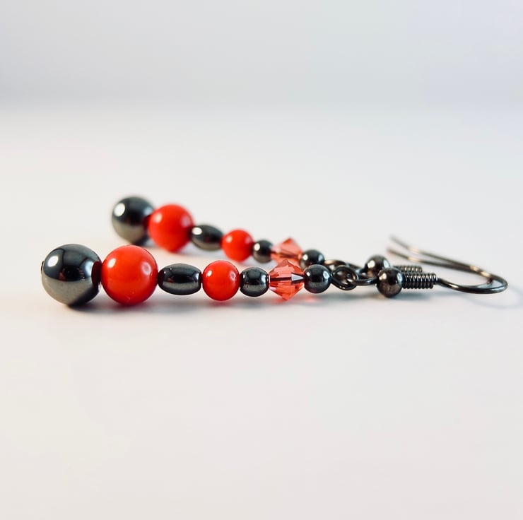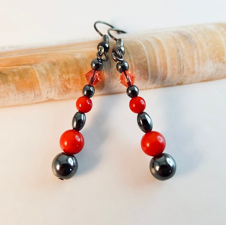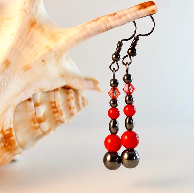 Mixed Hematite shapes and sizes, with a 6mm and 4mm red Bamboo coral bead and 4mm Swarovski 'padparadscha' bicone to add a splash of colour and sparkle against the shiny, gunmetal grey of the Hematite.