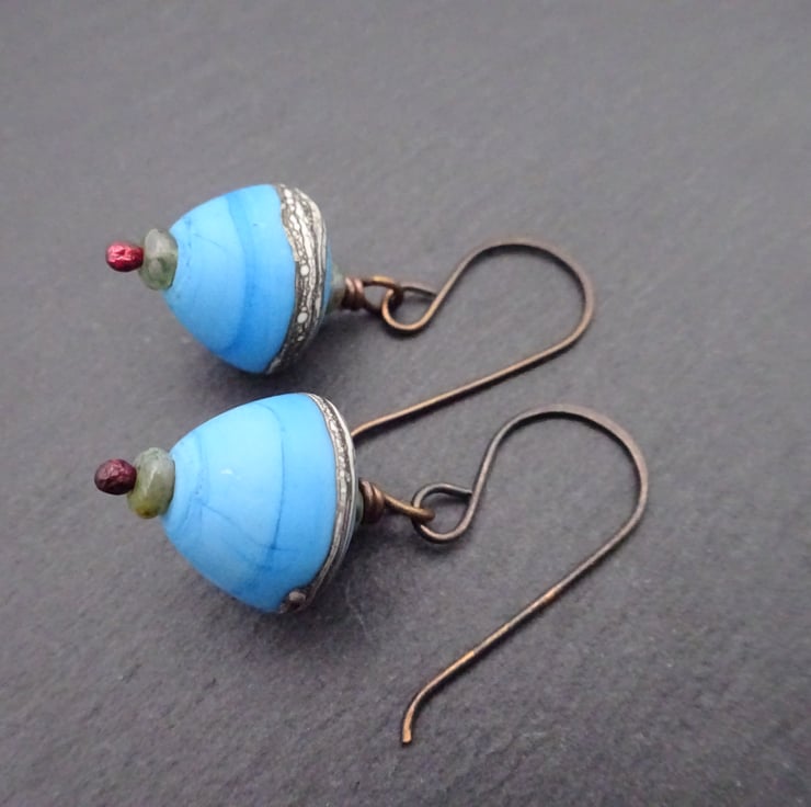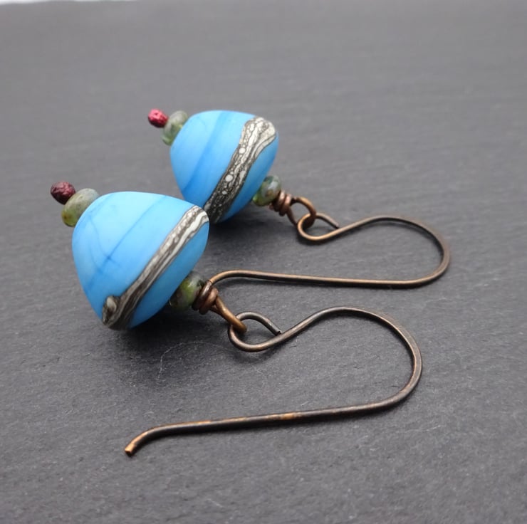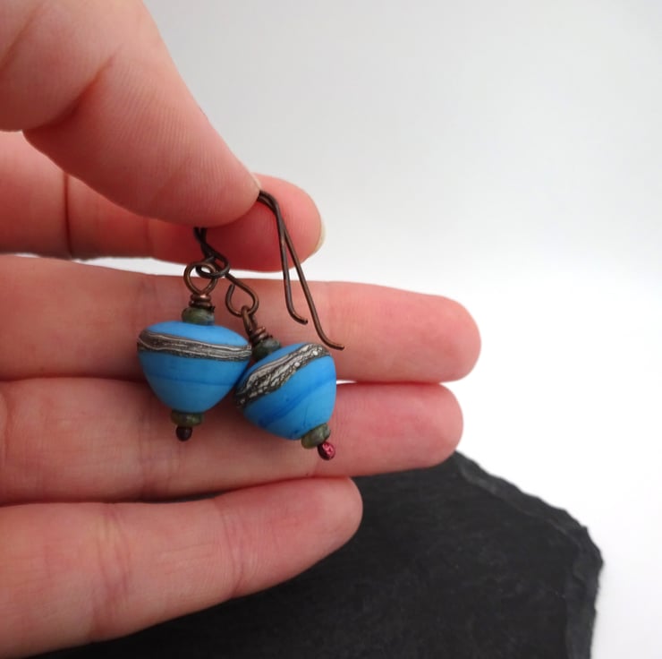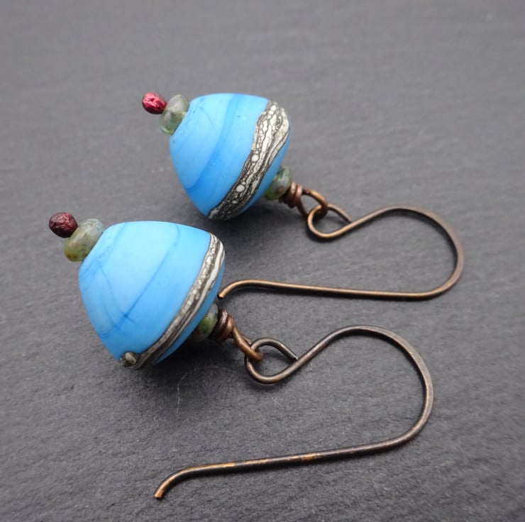 A pair of earrings made with handmade copper ear wires and handmade lampwork glass beads.