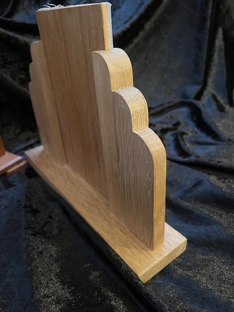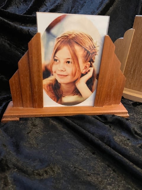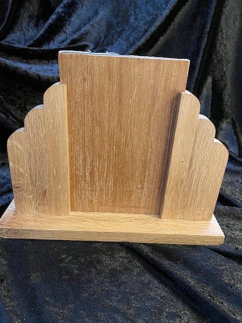 A hand made stand alone picture frame in 1940's style to take a 6" x4" photo. It has a veneered backing board and is finished in wax and satin acrylic. The glazing is crystal clear acrylic sheet for safety. I make these in a variety of woods, styles and finishes- to suit you. It would make an ideal Christmas gift if a photo of a loved one was added
