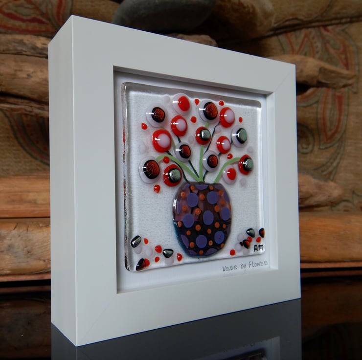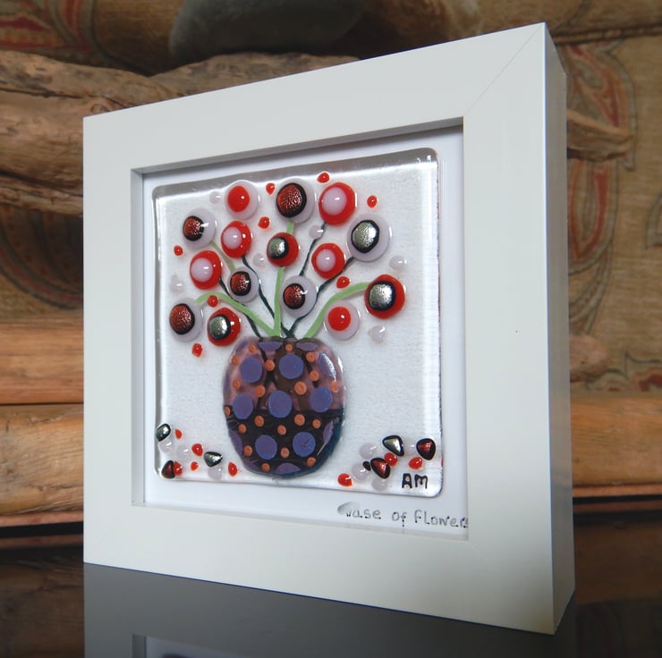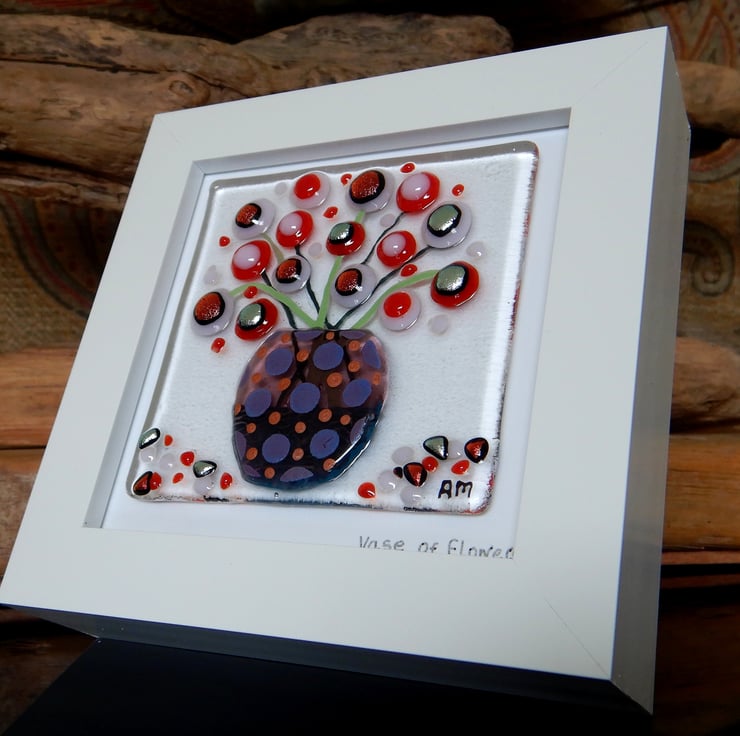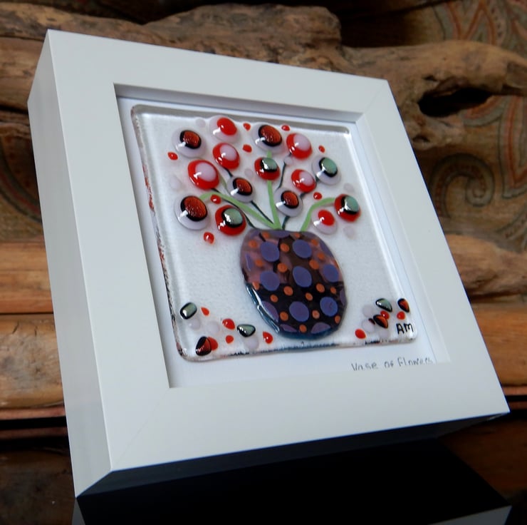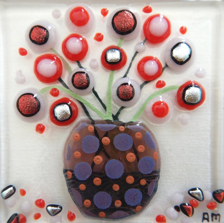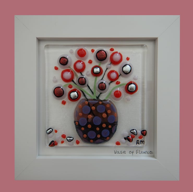 'Vase of Flowers' is made completely from glass which has been fused in my kiln. There is no enamel, glass paint or any other materials used, this picture is 100% pure bullseye fusing glass!