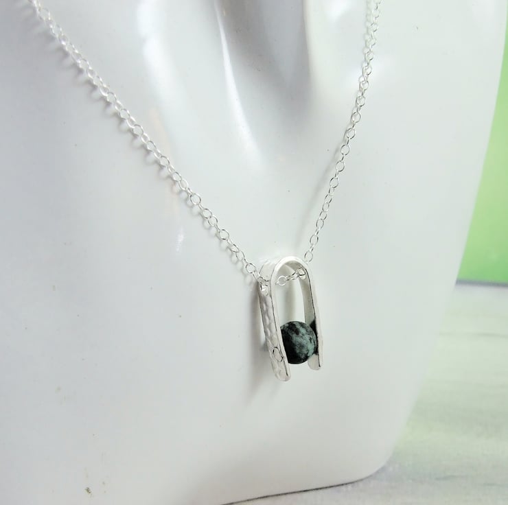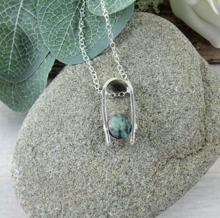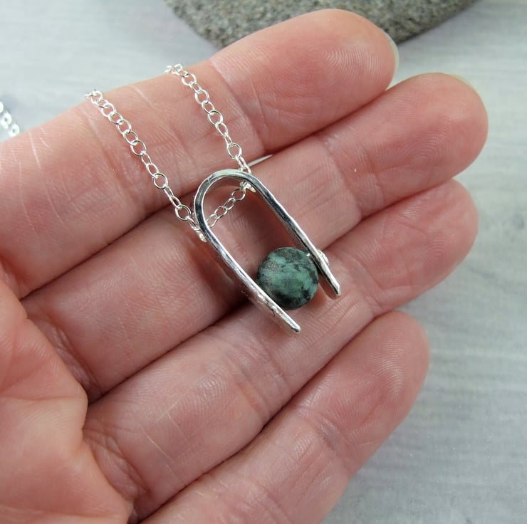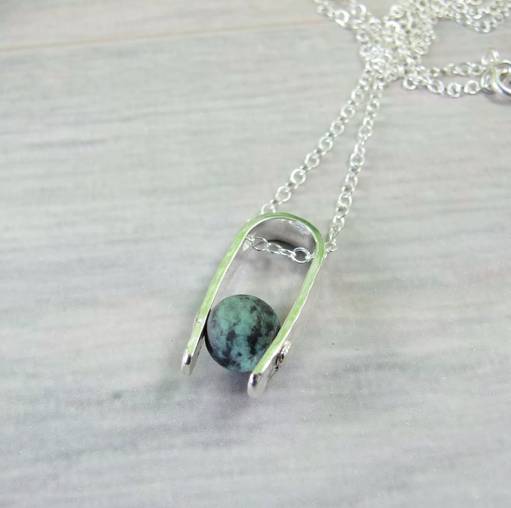 I have created the pendant bail from sterling silver sheet cut to length textured with a mottled pattern drilled through and shaped into a 'U'. I have then added an 8mm African Turquoise gemstone bead securely held in place with a sterling silver rivet. Fitted to an 18 inch .925 Sterling Silver Chain.