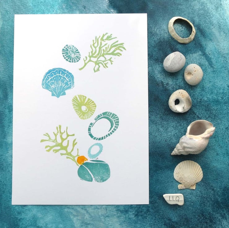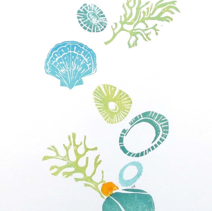 OOAK mono lino print of seashells, seaweed and pebbles inspired by rockpools in aqua, teal and green. Inspired by hours of rockpooling as a child and adult. Using a collection of different lino plates enables me to produce multiple varying compositions making no two prints the same.