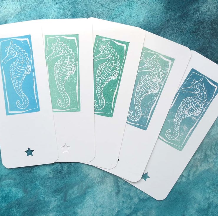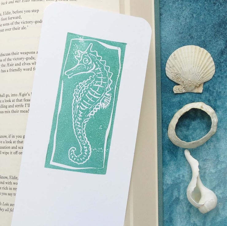 Handmade handprinted bookmark of a seahorse in summer green- perfect for marking the page for sea lovers, beachcombers, mermaids and salty seadogs summer reading.