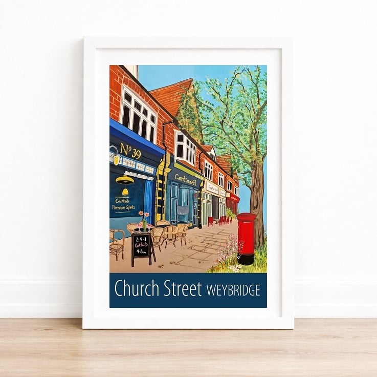 A contemporary travel poster style print of Church Street in Weybridge, Surrey, from my own original acrylic painting. A perfect gift for those who love Weybridge!