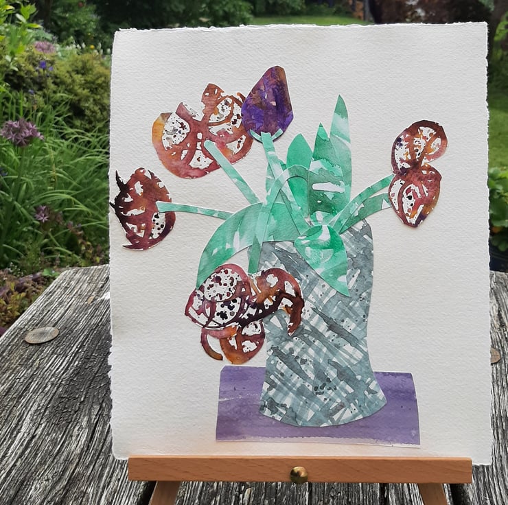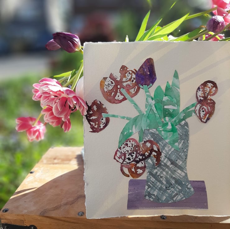 I use pre-painted papers for the colours from my stash, carefully choosing textures to describe the tulips rather than an exact match. See the photo of the collage with the actual tulips.