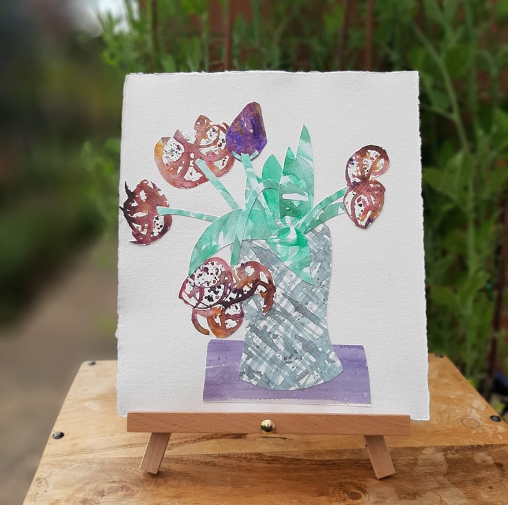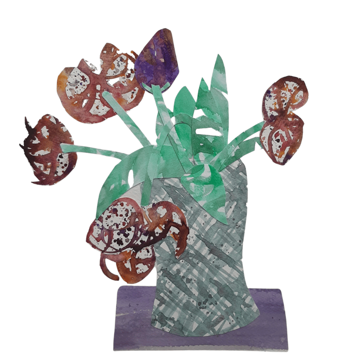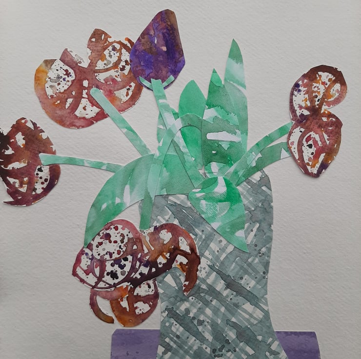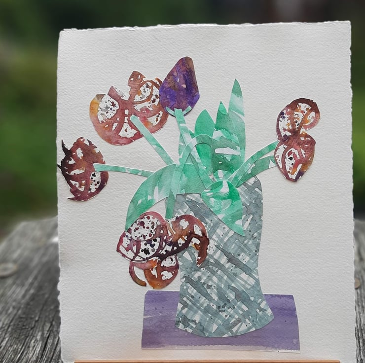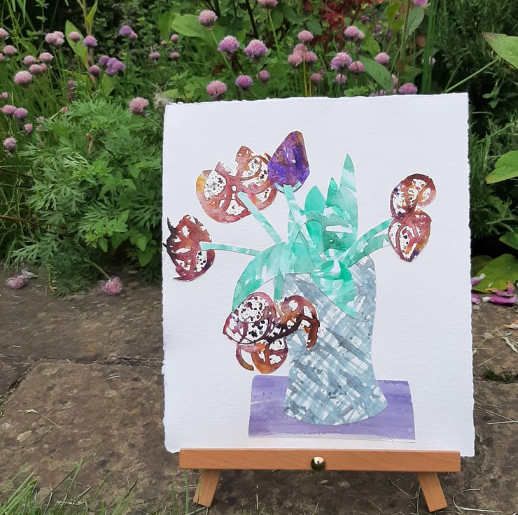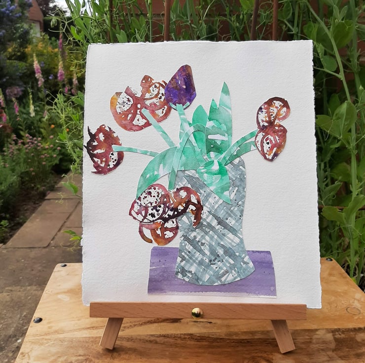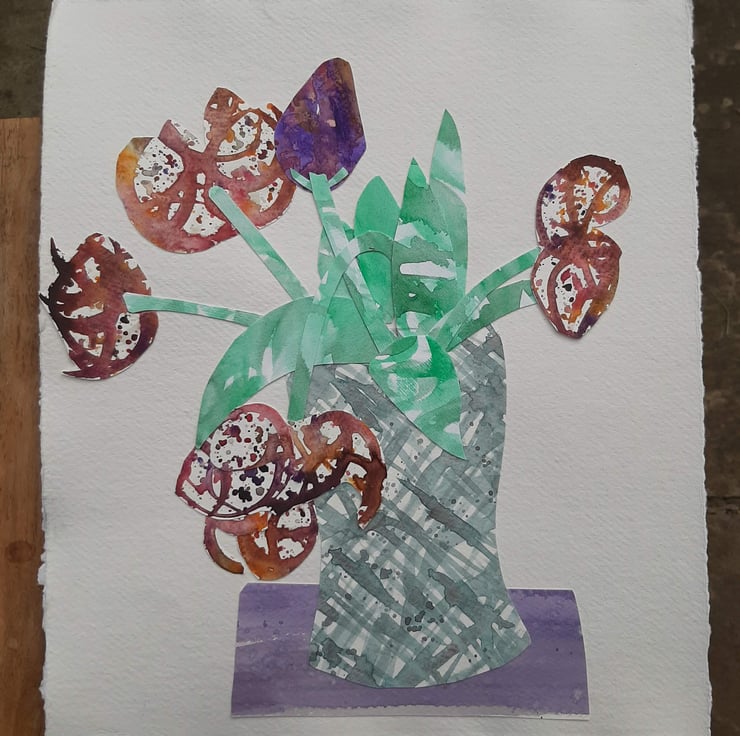 Each flower head, stem, leaf and vase is cut out individually before arranging together and securing in place onto the backing paper.