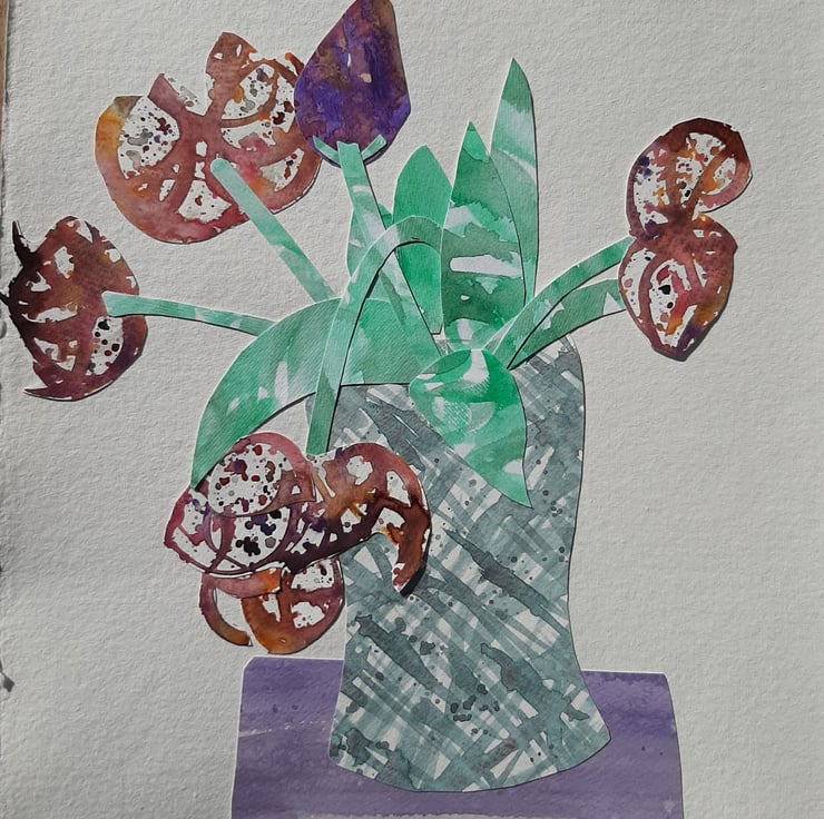 This paper collage is a study of tulips in a vase, created at the same time as my other two tulip collages (pink and purple).