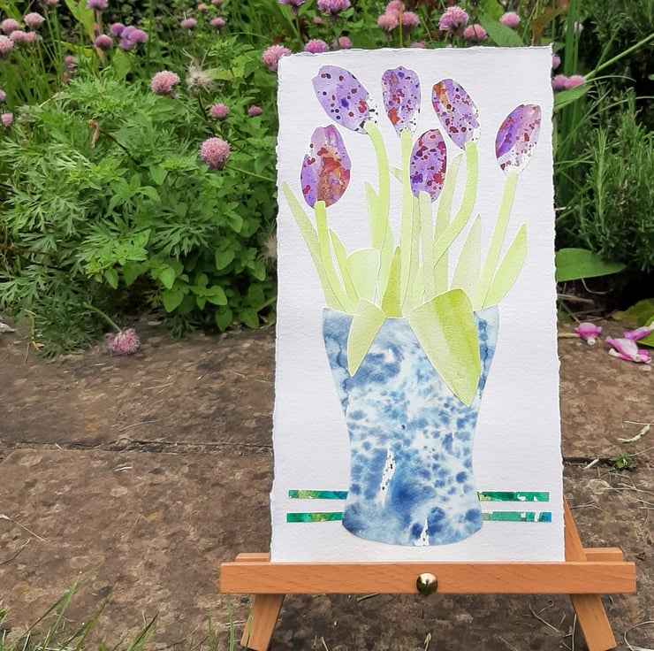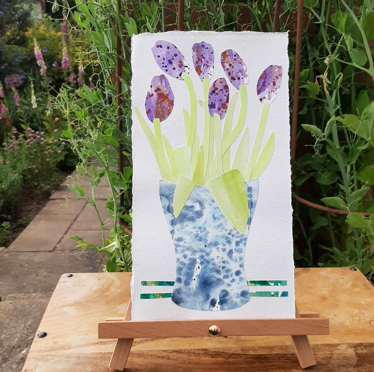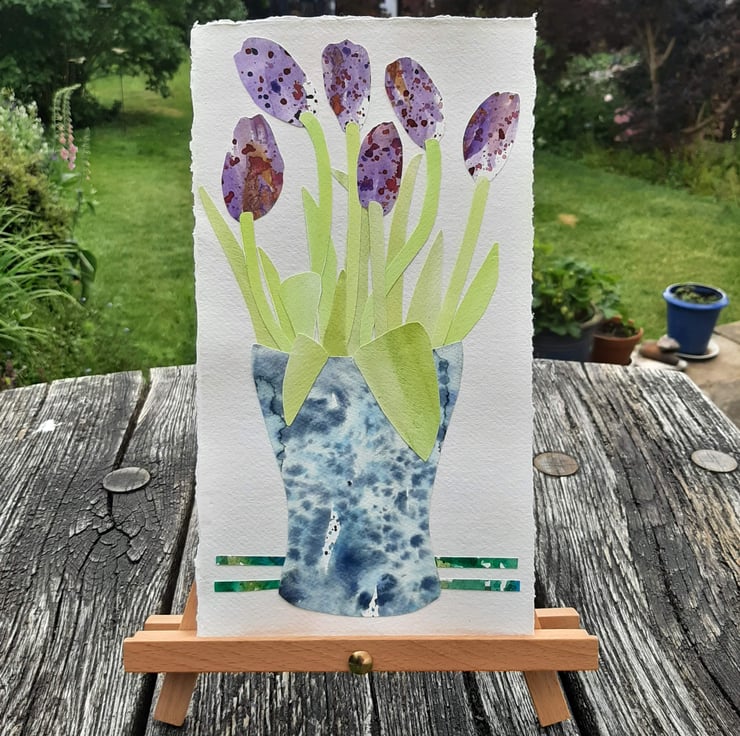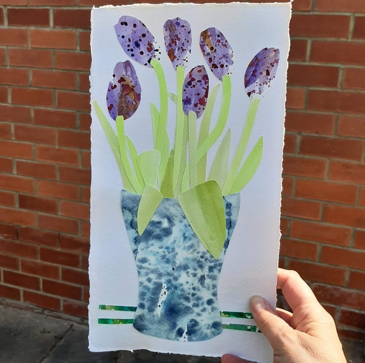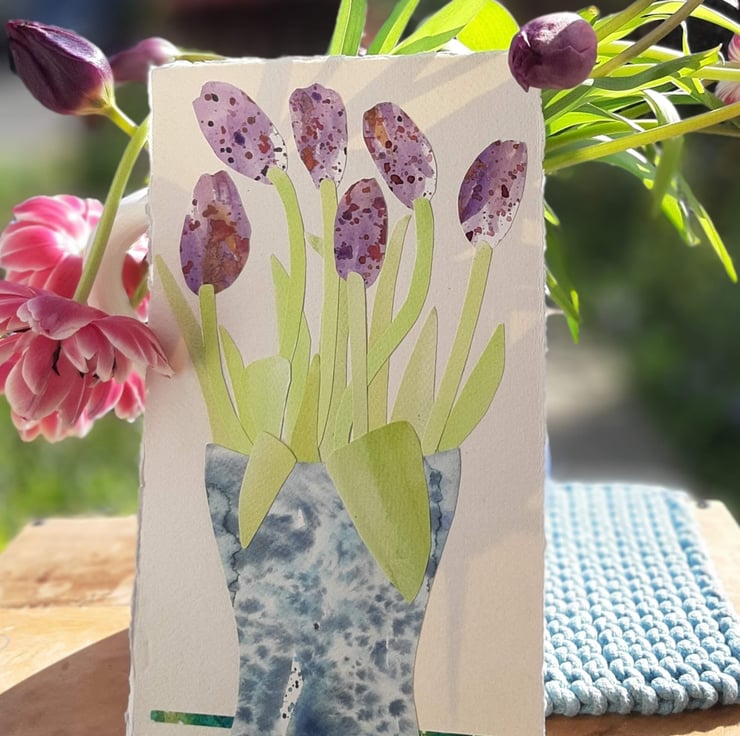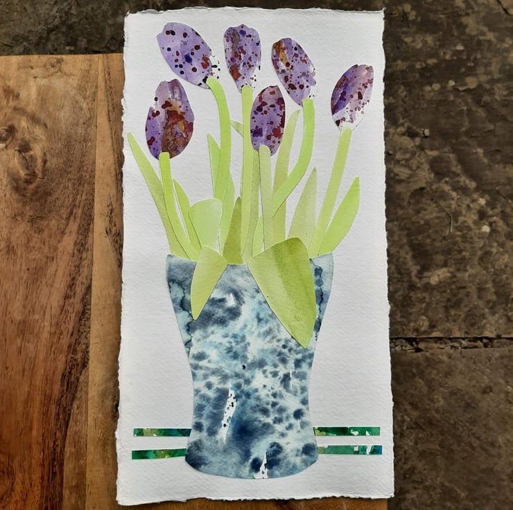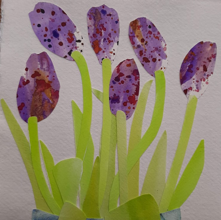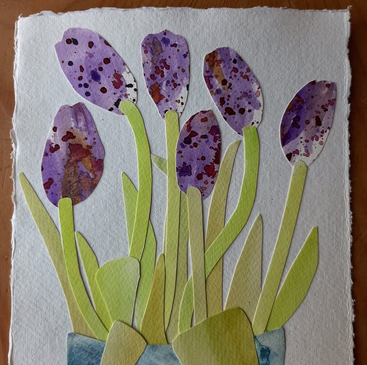 I use pre-painted papers for the colours from my stash, carefully choosing textures to describe tulips rather than an exact match. (See the photo with the tulips.)
