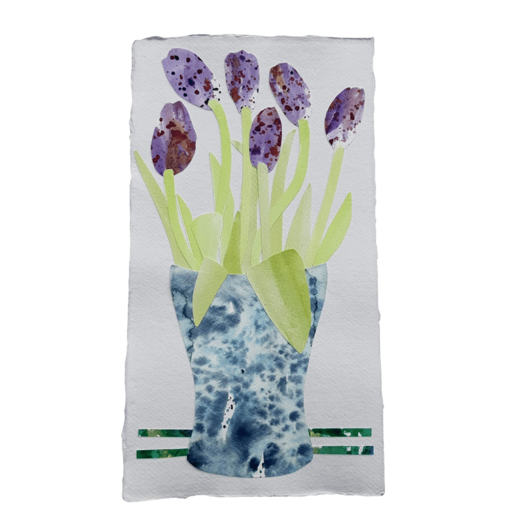 Capture the essence of spring's beauty all year round with this stunning paper collage. Immerse yourself in the enchanting world of purple tulips artfully arranged in a graceful vase. This piece will add a touch of elegance and natural wonder to any space.