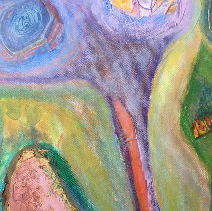 Evening Sun is an original mixed media/oil painting on canvas with painted sides. I created this piece by building up the canvas surface with layers of mixed media including, various papers, text and image from old books, foils, stamps and texture mediums and then over-painting it all with oil paint.