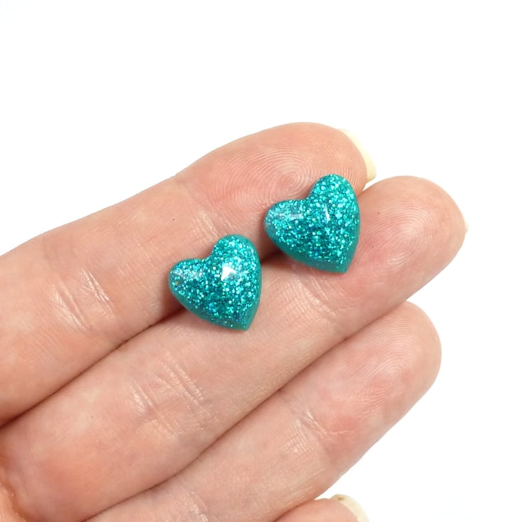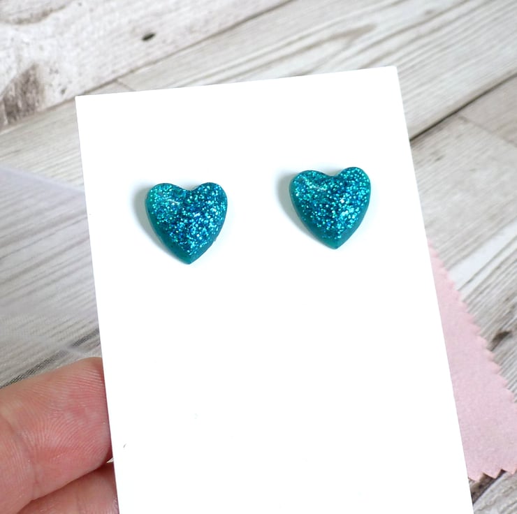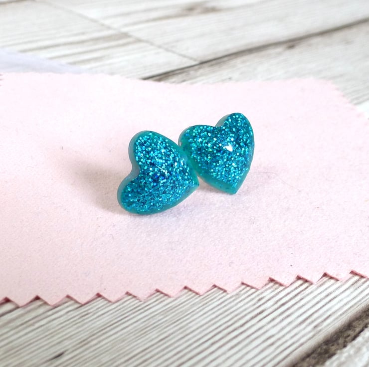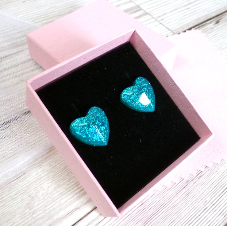 Made with bright turquoise glitter in resin, these twinkly, super-sparkly heart studs are perfect for a lover of colour, or a joyful jewellery gift for anyone who loves a bit of sparkle. Hypoallergenic Stainless Steel posts and butterfly backs.