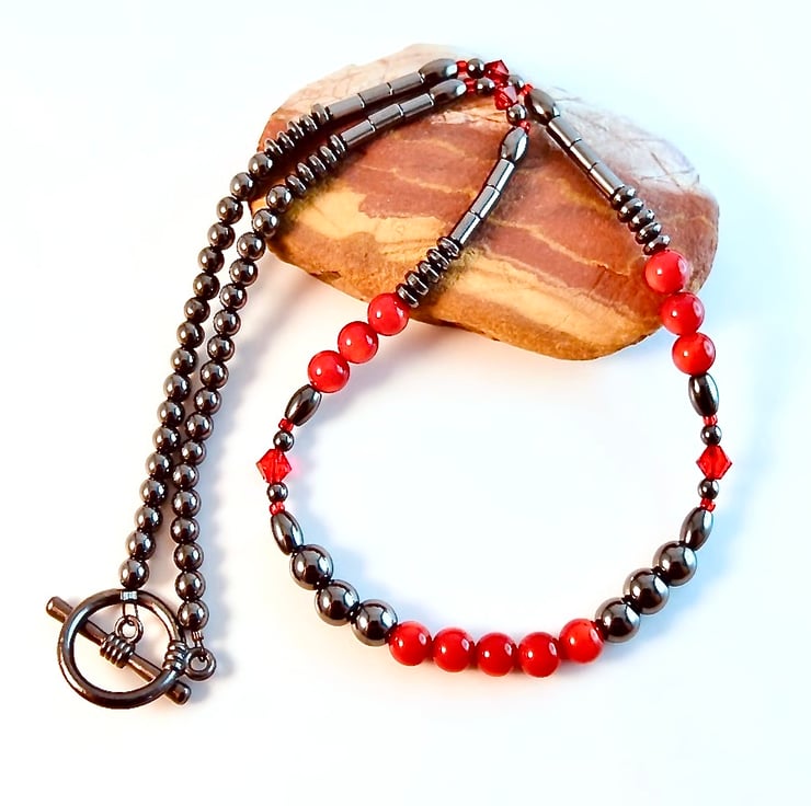 A striking necklace of hematite beads in an array of sizes and shapes, given colour contrast by the inclusion of red bamboo coral and sparkle from red Swarovski crystals.
