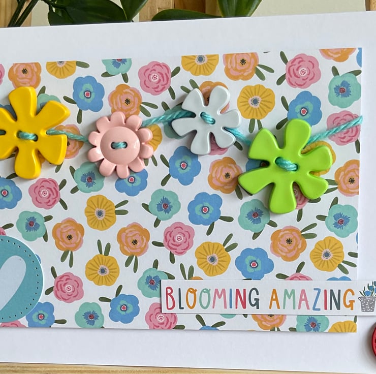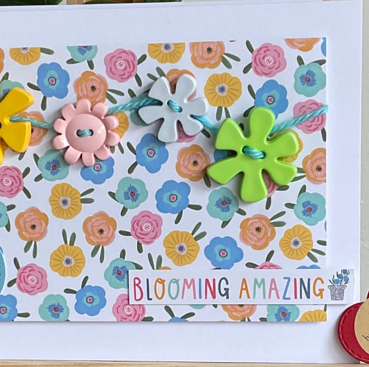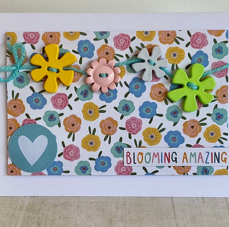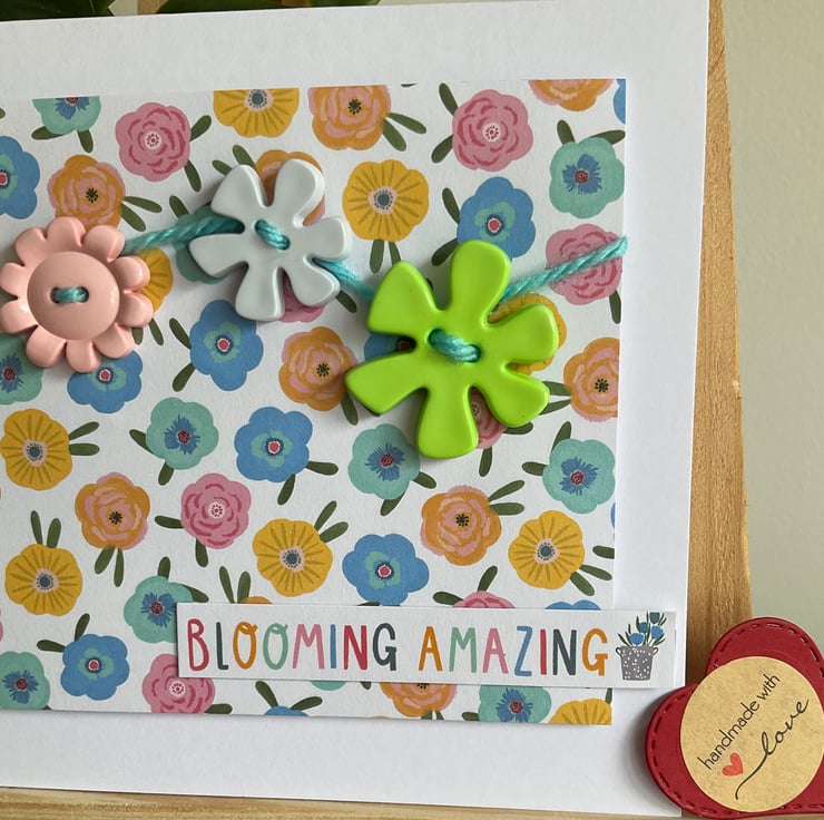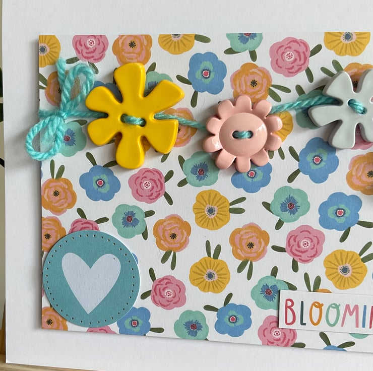 Blooming marvellous! A bright and colourful card with a brightly coloured floral background. Bright and chunky buttons have been hand sewn to the card using wool.